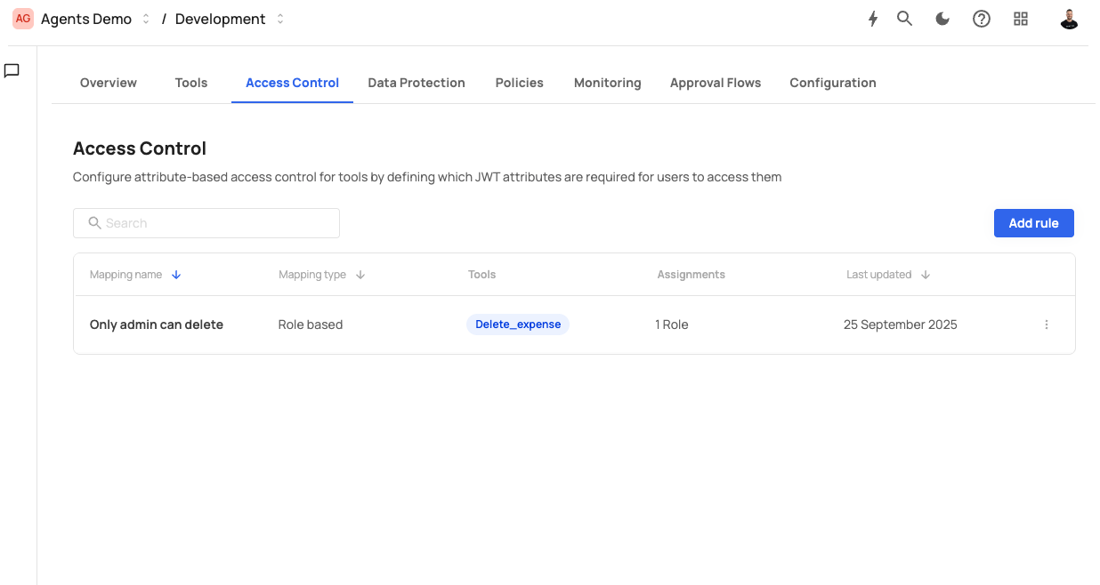 - Delete — Click the three-dot menu and select delete to permanently remove the rule. This removes the access restriction — affected tools become accessible to all authenticated users.