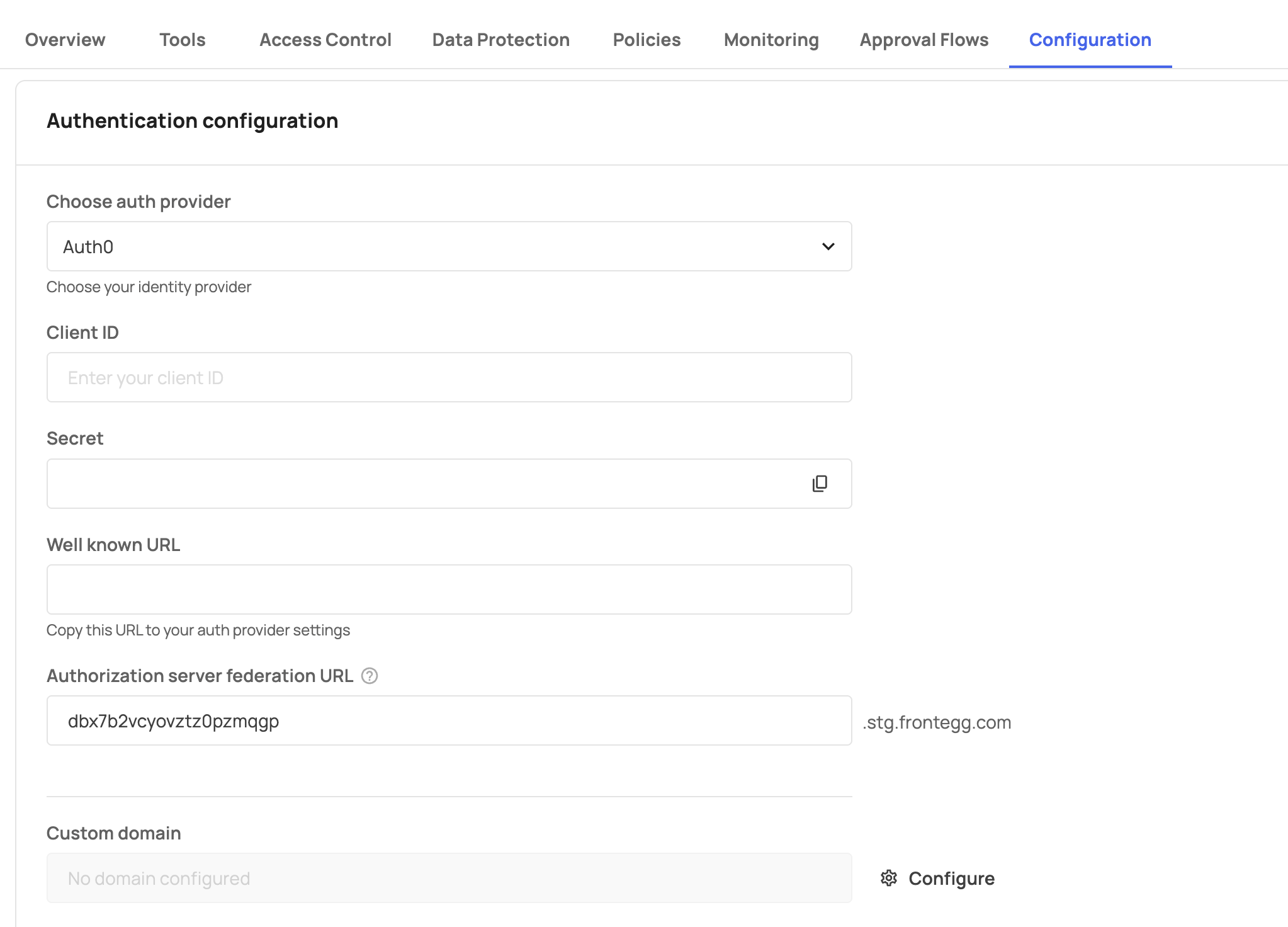 If no custom domain is configured, the system displays "No domain configured" and uses the default MCP gateway structure: [subdomain].mcp-gw.frontegg.com