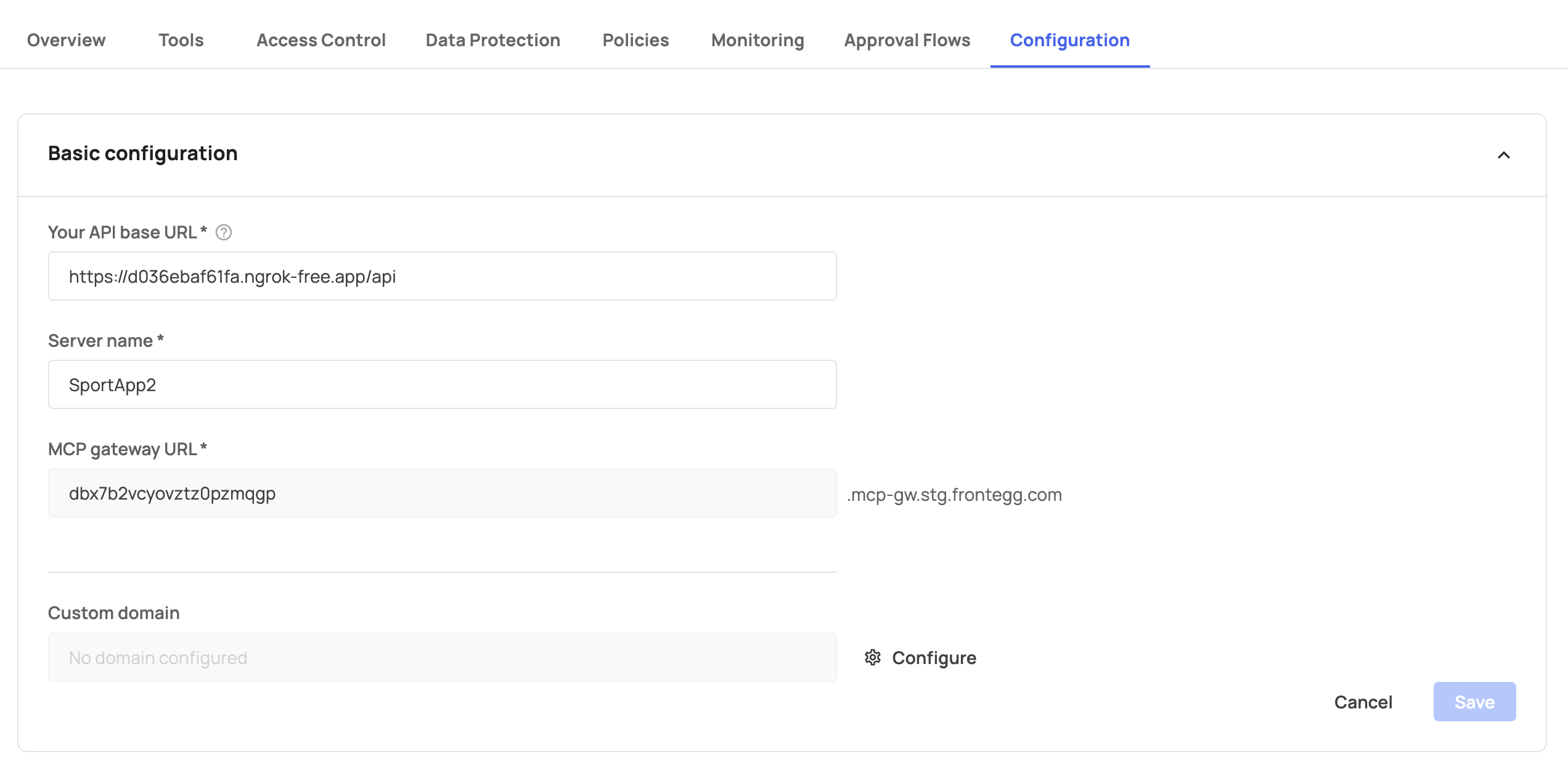 In the Basic configuration section, you'll see the MCP gateway URL field displaying your subdomain prefix (e.g., dbx7b2vcyovztz0pzmqgp) followed by .mcp-gw.frontegg.com.
