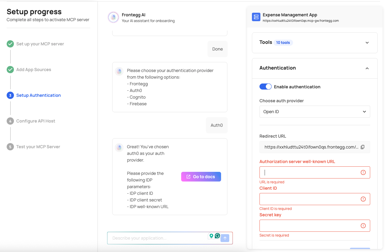 | 3. Set up authentication | Choose your auth provider (Frontegg or OpenID Connect). |