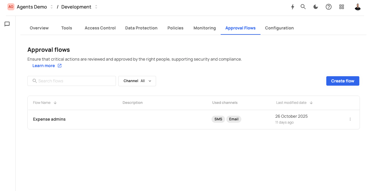 Approval flows in Agen for SaaS define the human-in-the-loop review process for sensitive tool calls. When a policy triggers a Request approval action, the tool call is paused and routed to the configured approval flow, where designated approvers review and approve or reject the request.