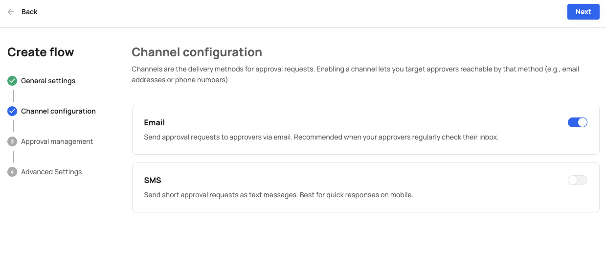 Enable at least one channel to ensure approvers receive notifications. Click Next to proceed to Step 3.