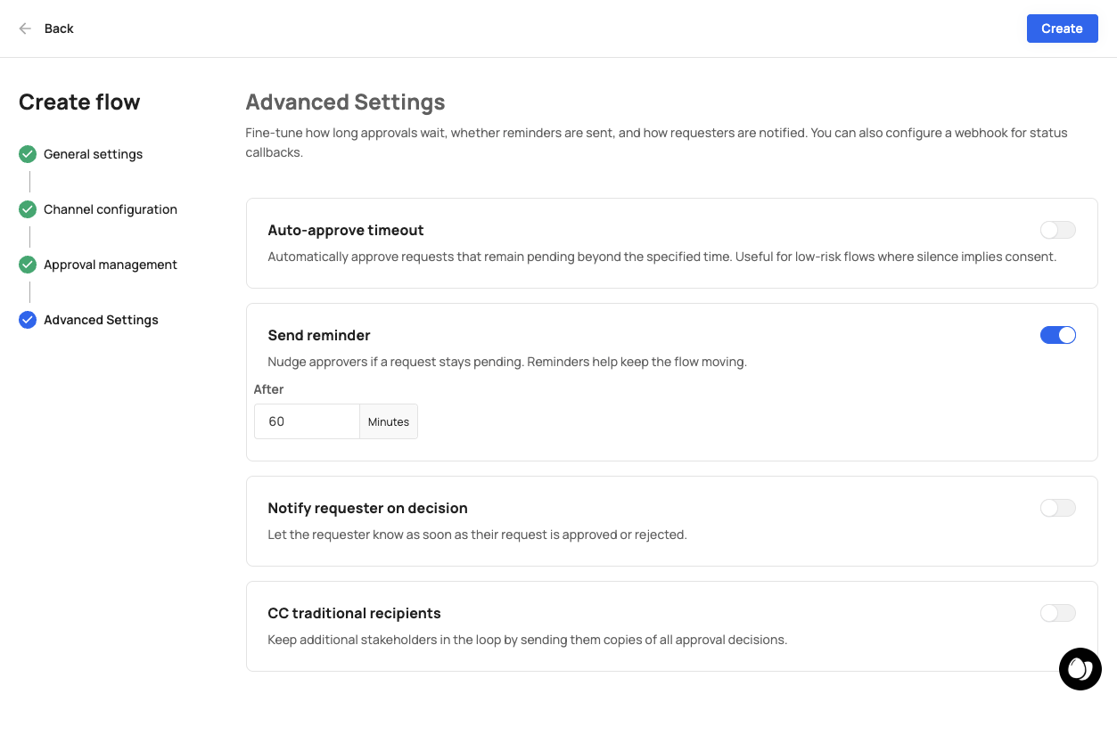 Fine-tune how long approvals wait, whether reminders are sent, and how requesters are notified. You can also configure a webhook for status callbacks.