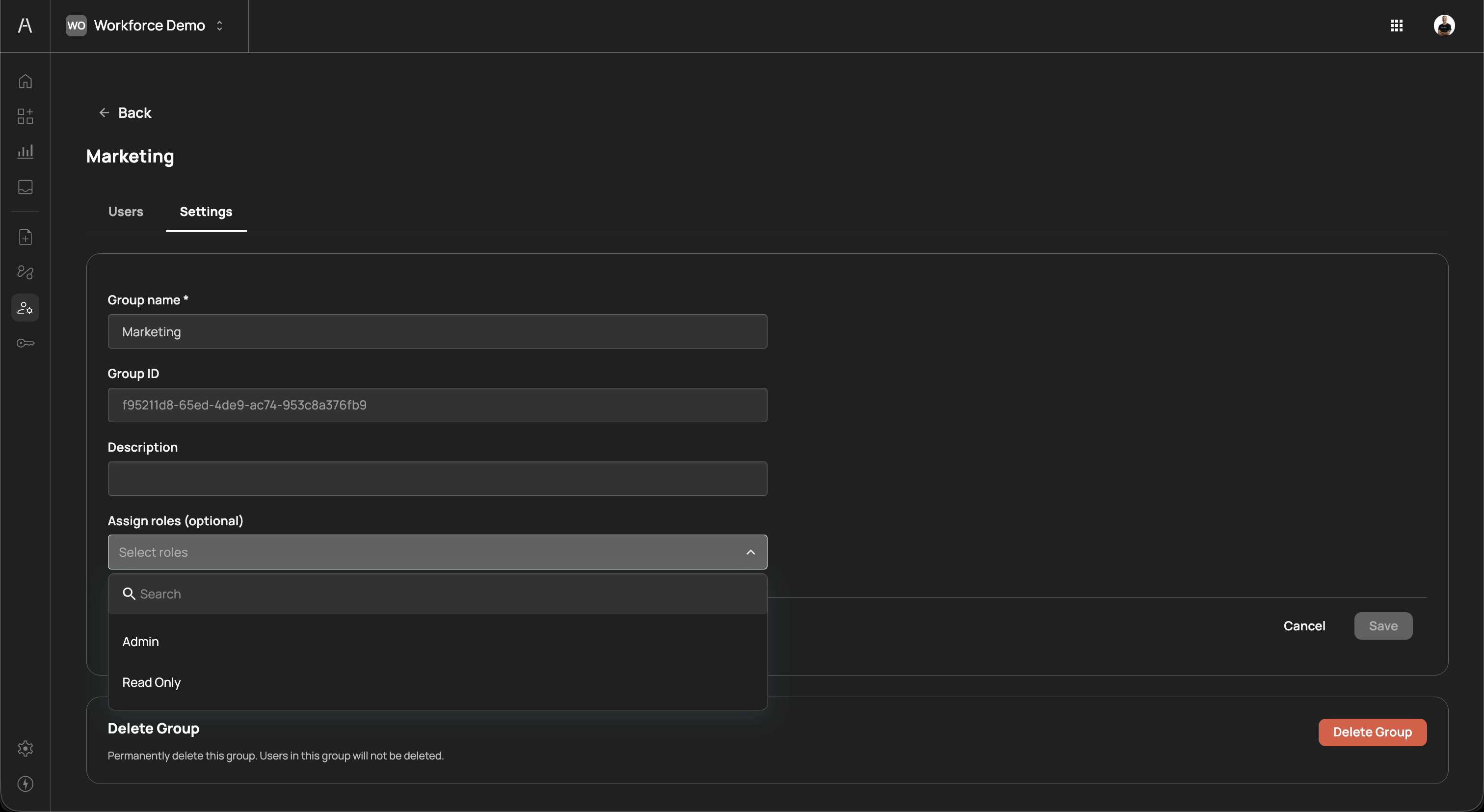 - Assign roles to groups for administrative access — Use the Assign roles dropdown in group settings to grant Admin or Read Only access to Agen for Work at the group level