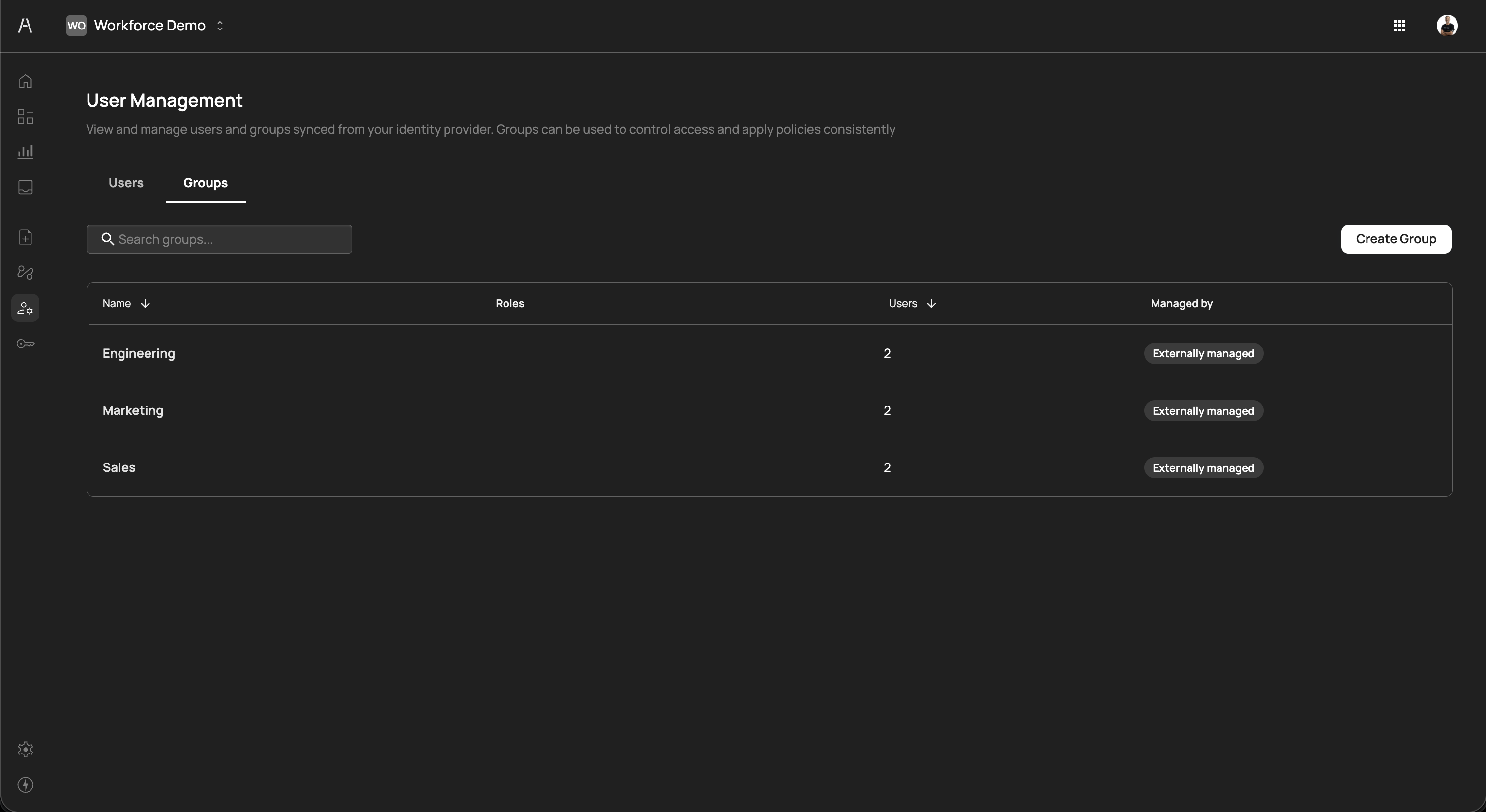 While groups are typically synced from your identity provider, you can also create groups manually by clicking Create Group in the top-right corner of the Groups tab. Manually created groups are useful when you need policy groupings that do not map directly to your IdP's organizational structure.