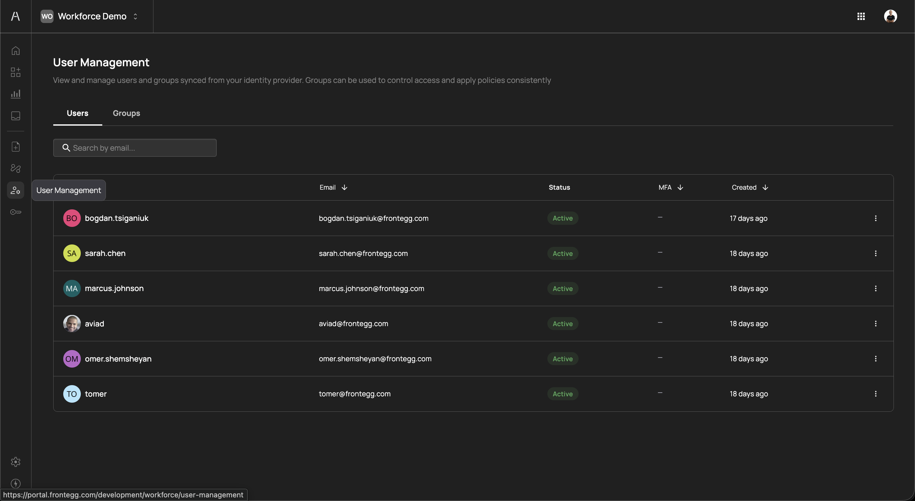 The User Management page is your central hub for viewing and managing the users and groups synced from your identity provider. Groups can be used to control access and apply policies consistently across teams, ensuring that AI agent permissions stay aligned with your organization's structure.