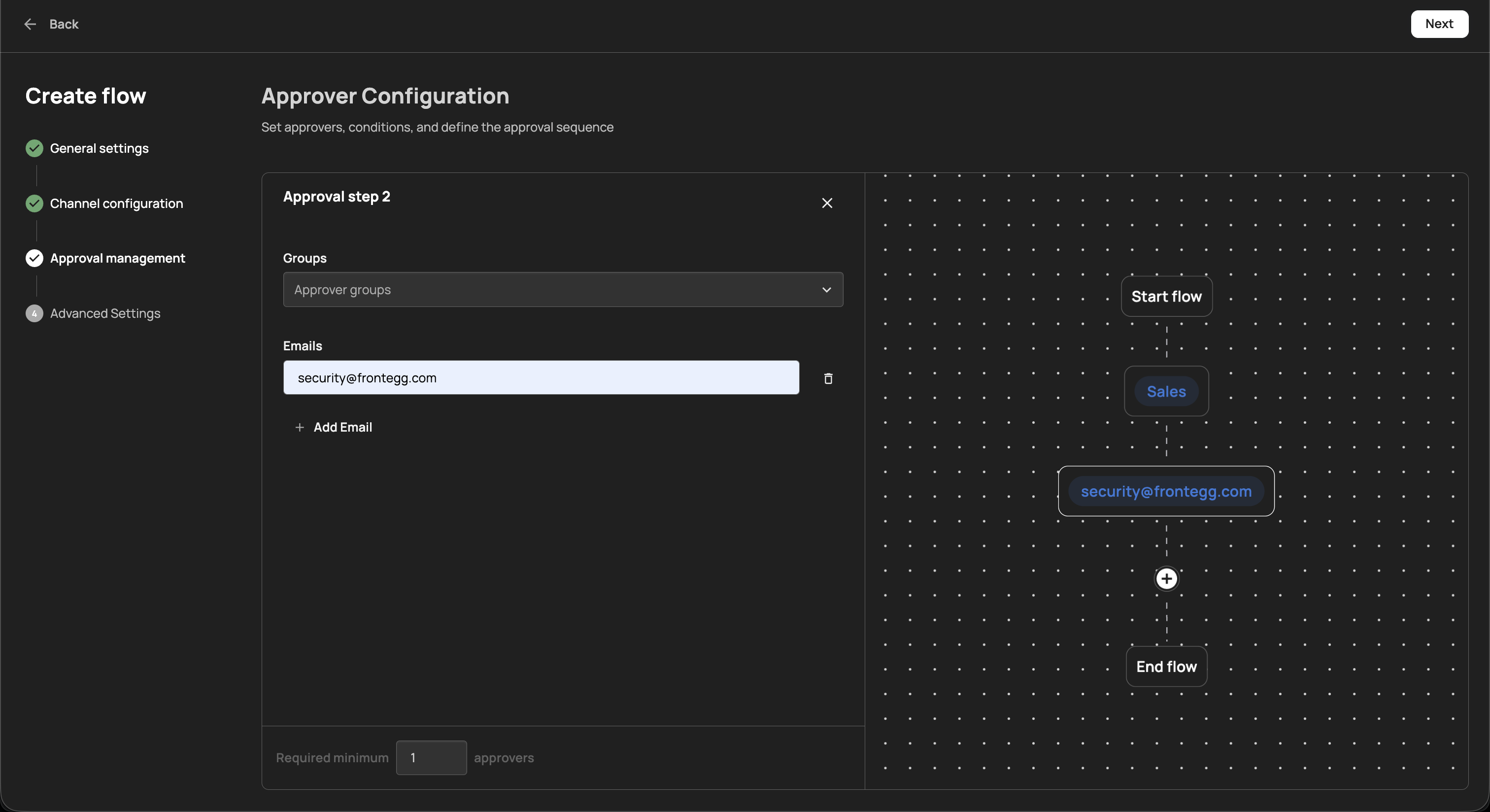Toggle one or both channels on depending on how you want approvers to be notified. You must enable at least one channel. Click Next to proceed to approval management.