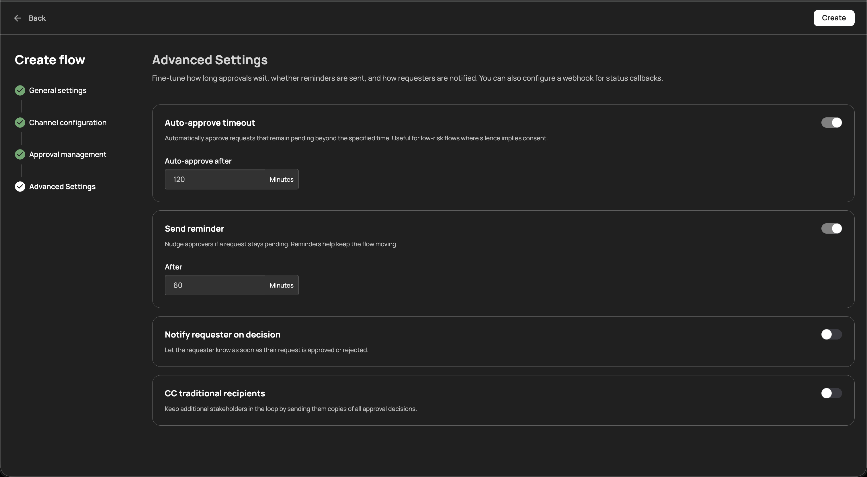 After configuring the advanced settings, click Create to finalize the approval flow. Click Back at any point to return to the previous step.