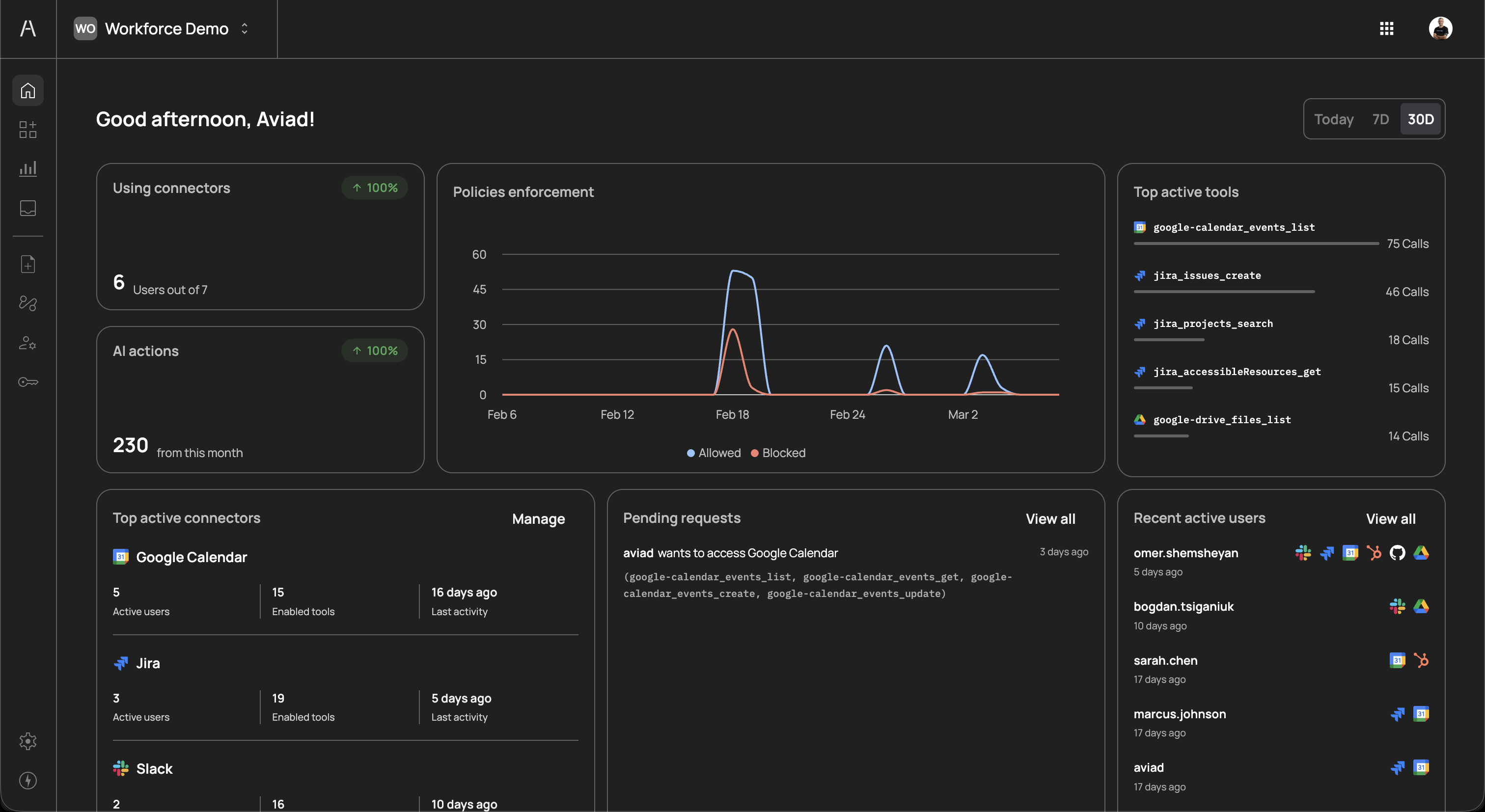 Each action represents a single tool invocation by an AI agent — for example, listing Google Calendar events, creating a Jira issue, or searching Google Drive files. Monitoring this metric helps you gauge the overall productivity impact of your AI agent deployment and forecast capacity needs.