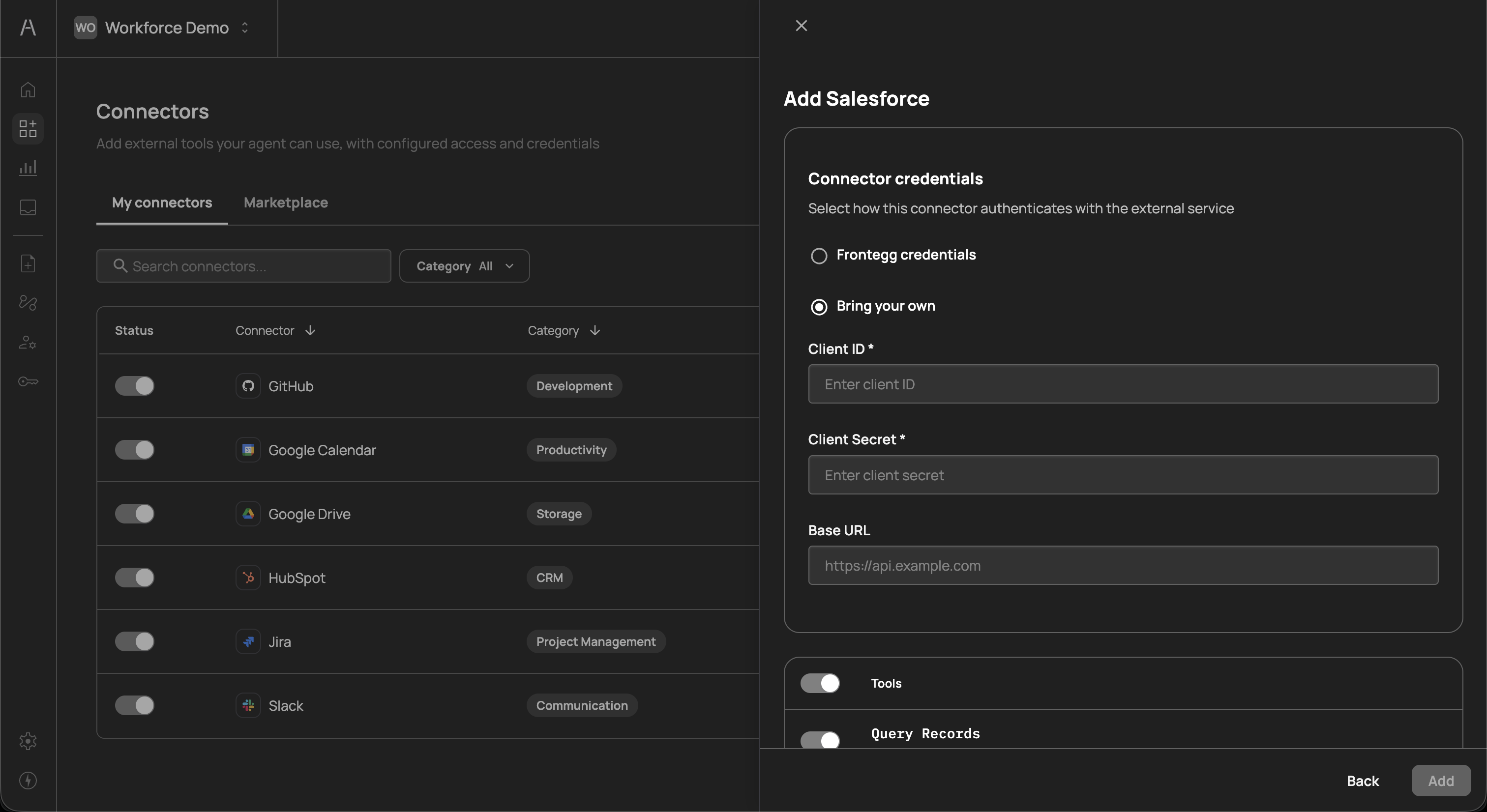 Connectors are the integration layer between your AI agents and the external SaaS tools your workforce uses every day. Each connector represents a link to a third-party service — such as Slack, Jira, GitHub, Google Calendar, or Salesforce — and exposes a set of tools that AI agents can invoke on behalf of your users.