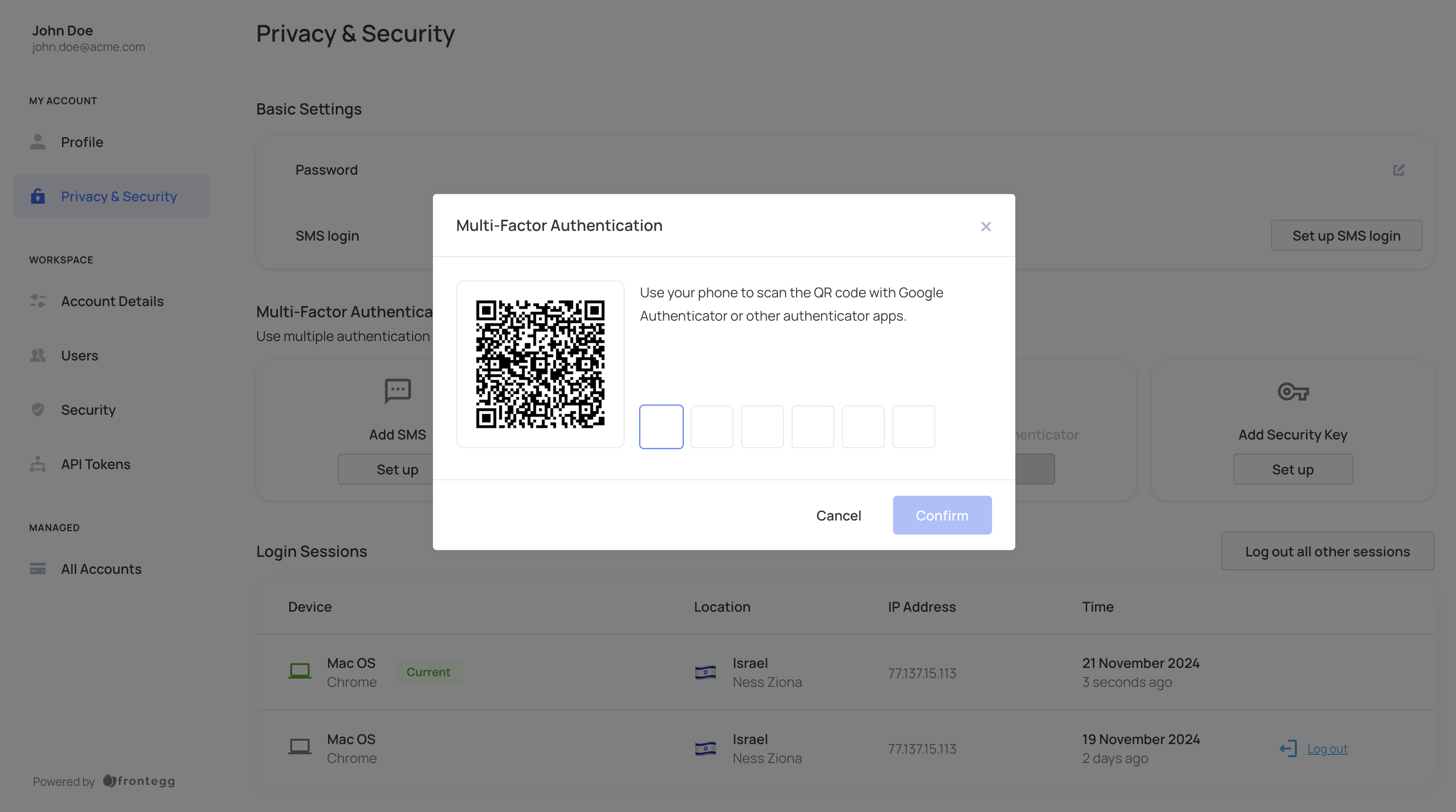 After choosing the second factor, the user will be provided with a recovery code that they must save somewhere, in case they lose their phone. Users can also be unenrolled from existing MFA devices via the Frontegg dashboard, management section, or via API.