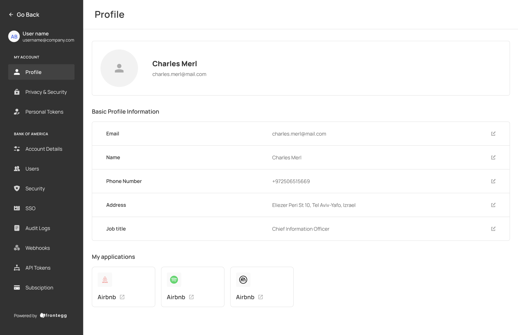 The User Profile section in the personal space is where Frontegg users can enter and edit information about themselves.