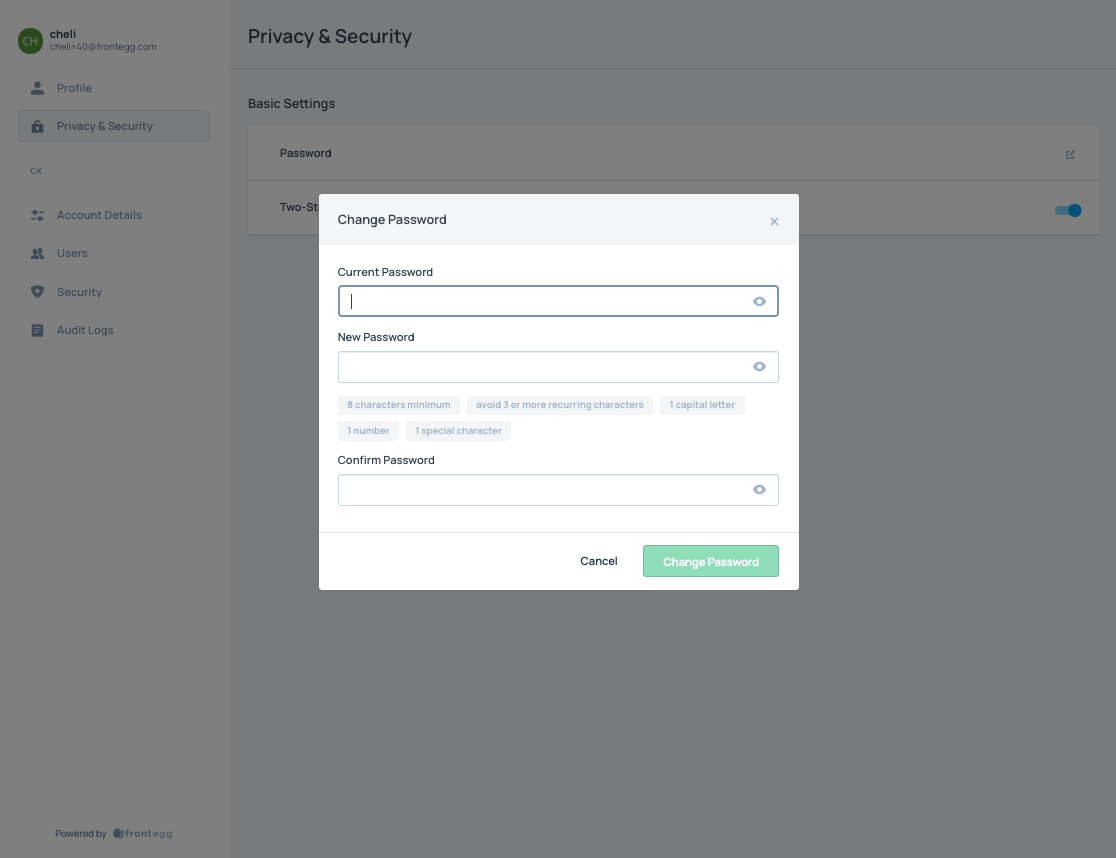 With Frontegg, you can embed the self-service portal into your application, allowing users to handle these tasks independently. Using the Frontegg Builder, you control which features are available, ensuring a tailored experience.
