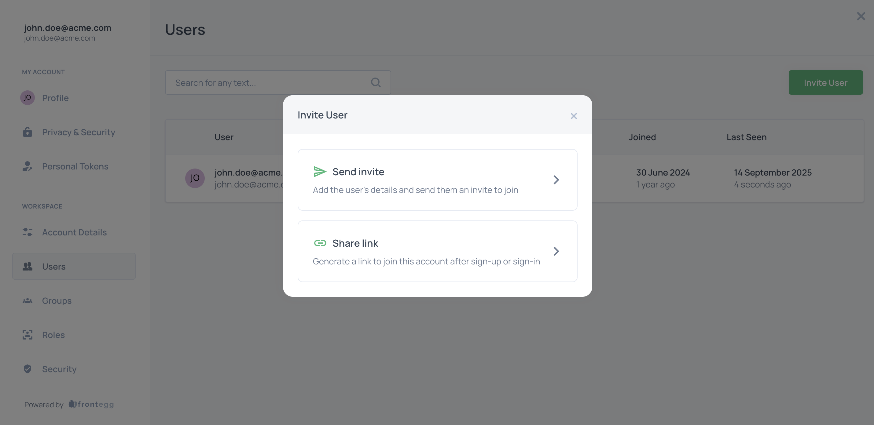 Alternatively, end users can share an invitation link, which will automatically sign up or add the new member to the dedicated account. The new user will get the same roles as the user who generated the invitation link for them.