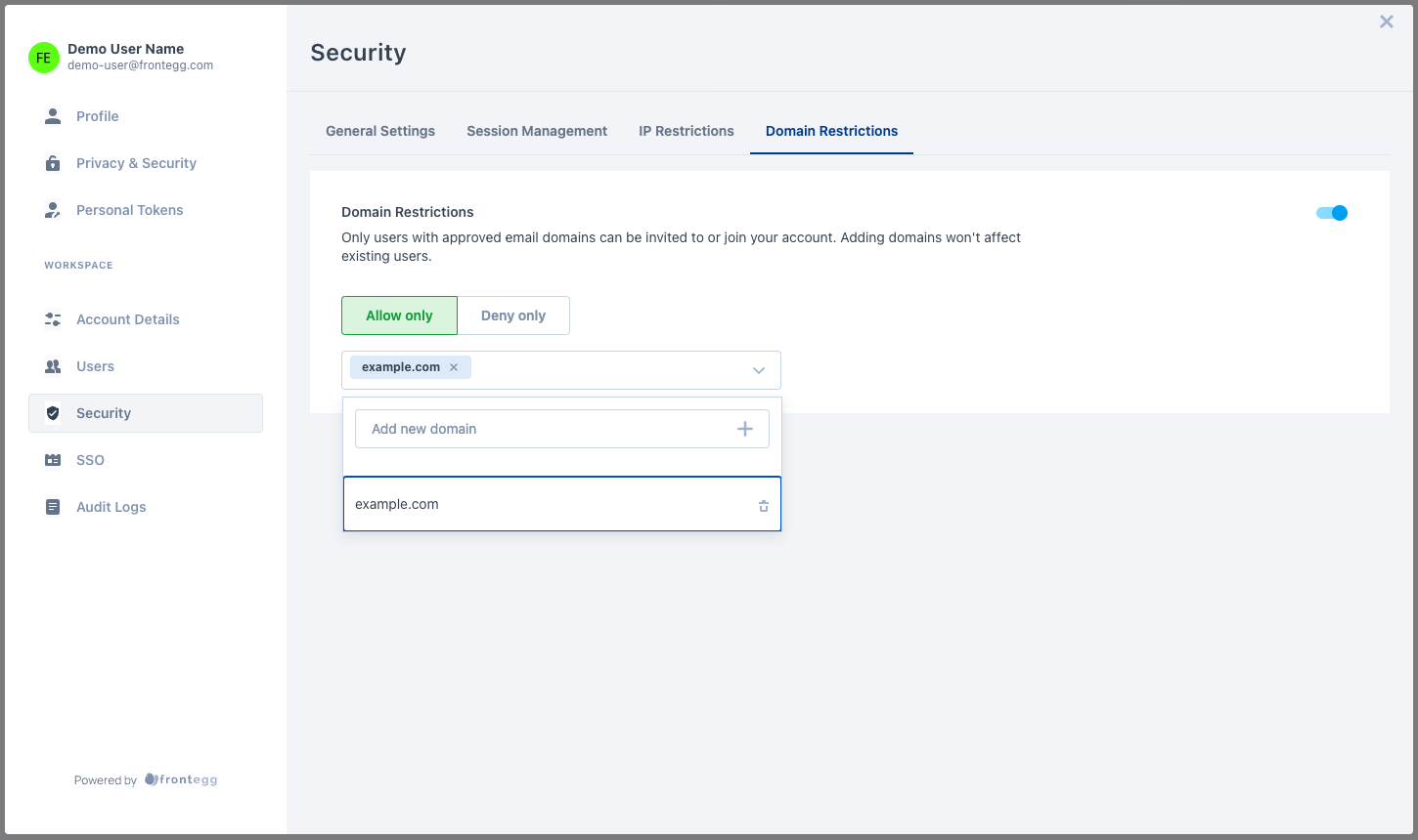 Note: Configuring domain restrictions doesn't affect existing users.