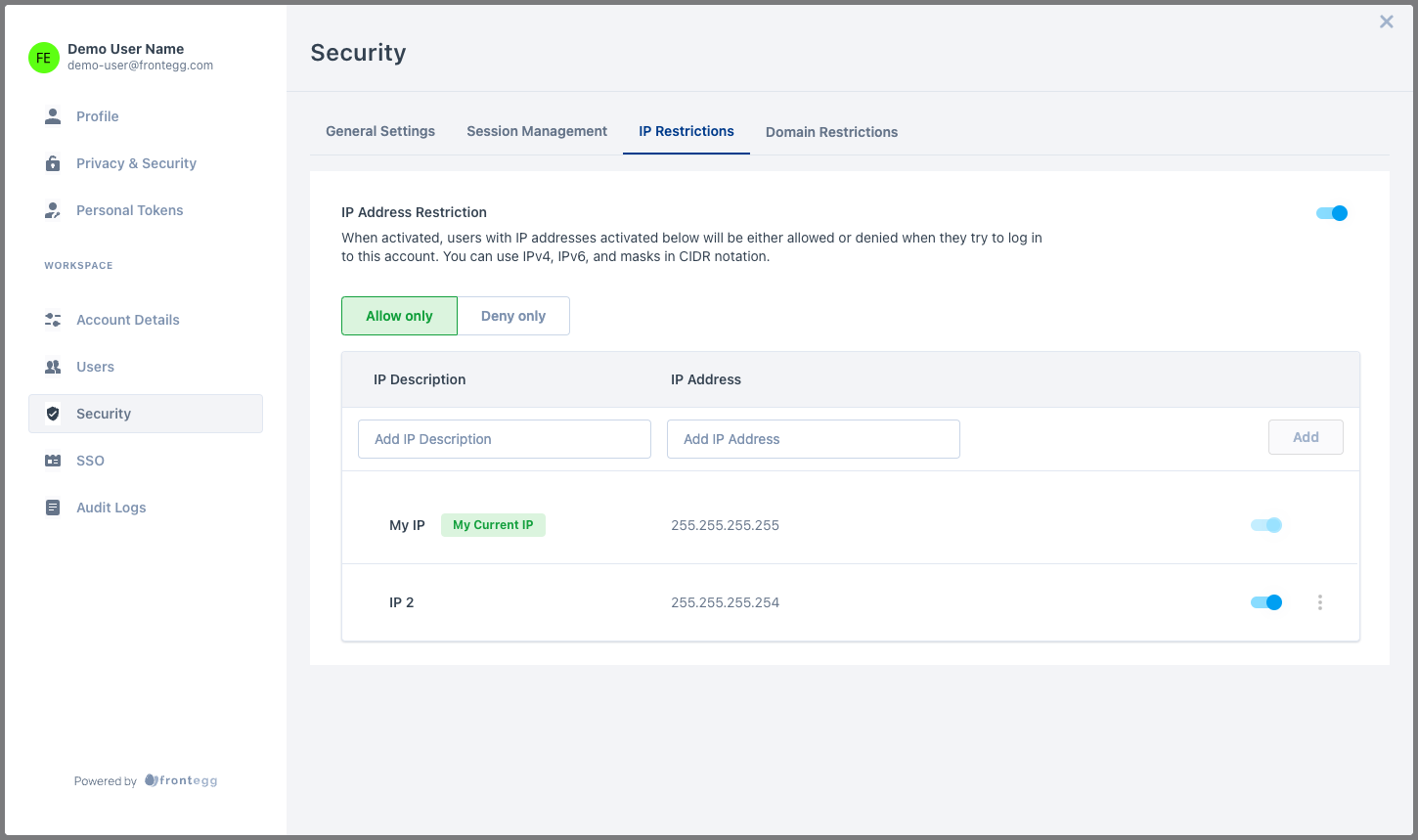 IP Restrictions give your customers the ability to restrict login or signup to certain IP addresses. The rules can contain IPv4 (e.g., 255.255.255.255), IPv6 (e.g., 2345:0425:2CA1:0000:0000:0567:5673:23b5), and masks in CIDR notation (e.g., 192.0.2.0/24 or 2002:abcd:ffff:c0a8:101/64).