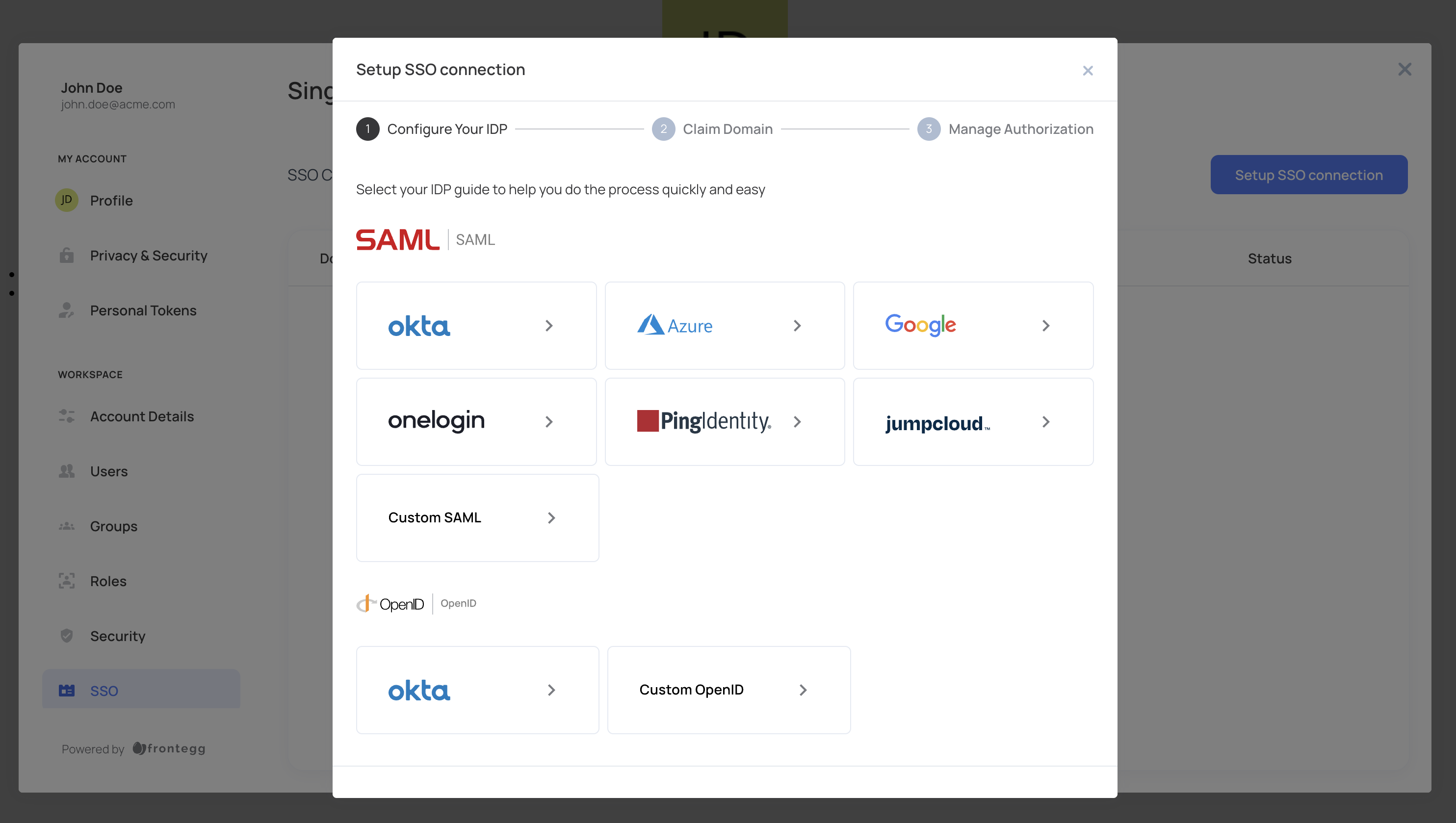 End users can easily set up login via single sign-on to their account from the SSO page. Frontegg provides multiple embedded walkthrough guides with detailed steps for each external identity provider. More details can be found in the dedicated SSO section.