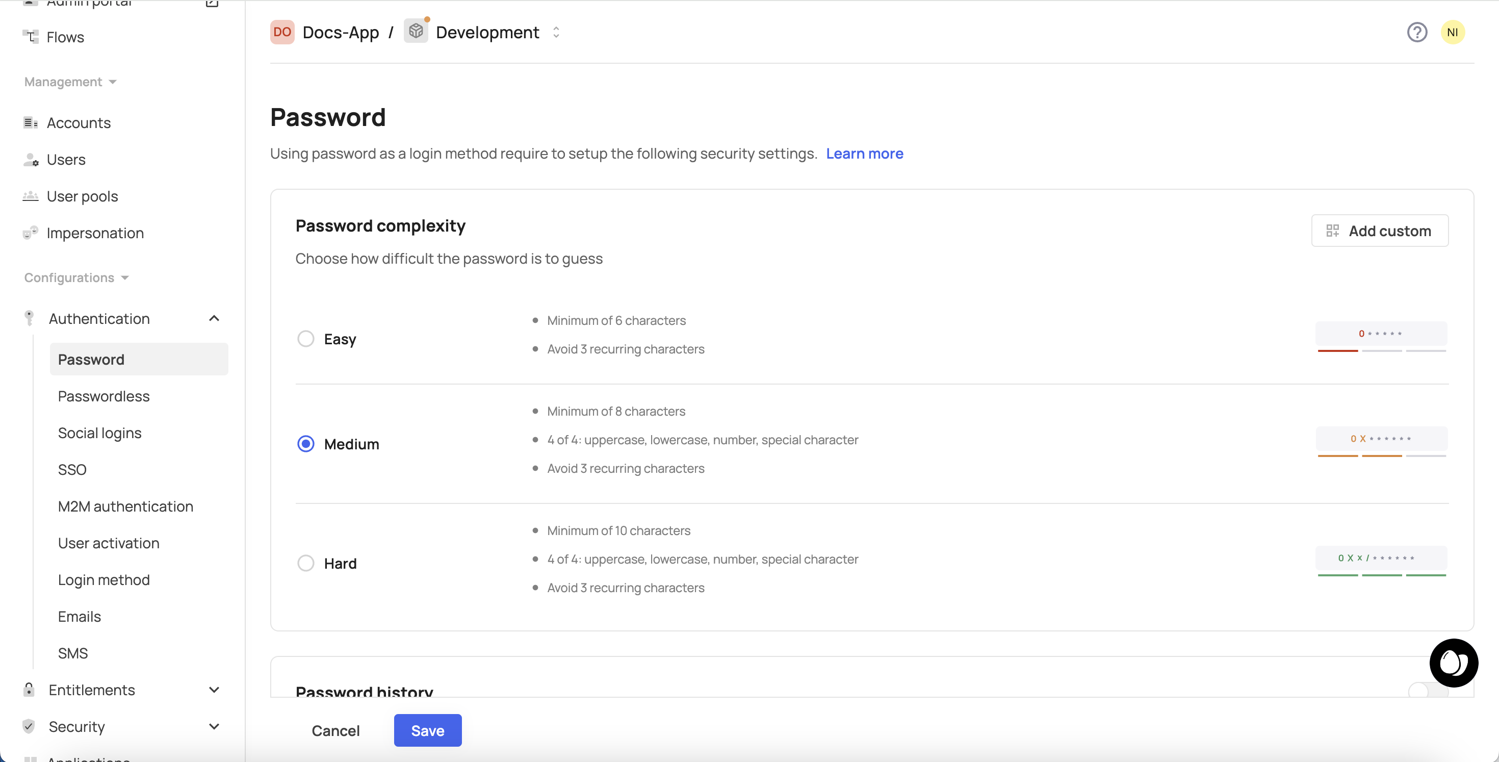 Define how strong user passwords must be. You can choose from preset levels or define custom rules.