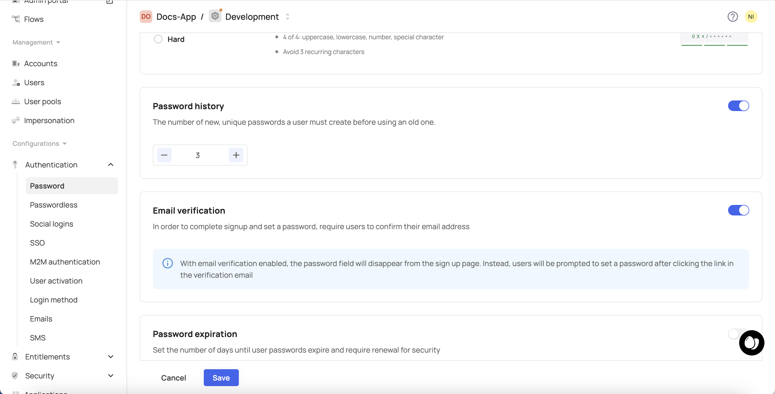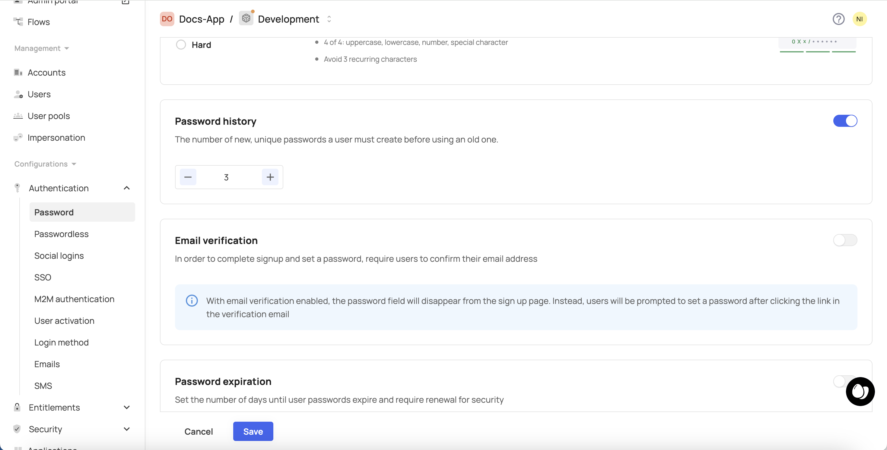 Frontegg allows you to define and enforce secure password policies across your platform. As an admin, you can manage password settings globally at the environment level, override them for specific accounts, and even assist individual users with password resets — all through the Frontegg portal.