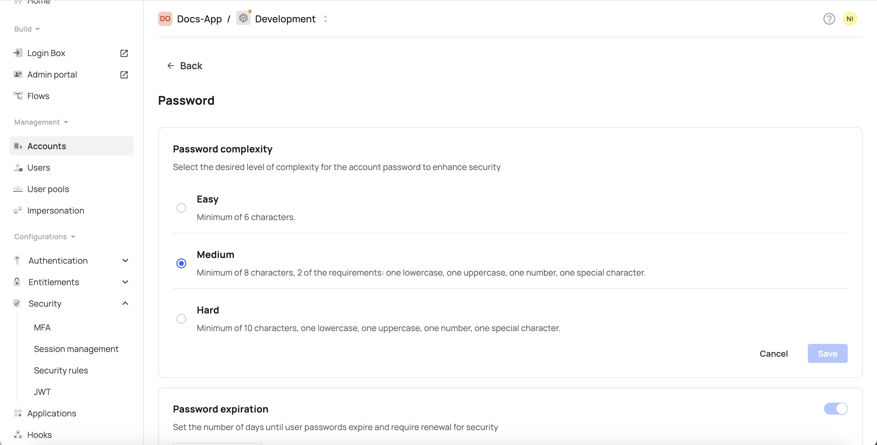 Set the number of days after which a user’s password must be updated. You can also configure how many days before expiration a prompt should appear. To do this, toggle Password Expiration on and set the number of days until user passwords expire and require renewal for security.