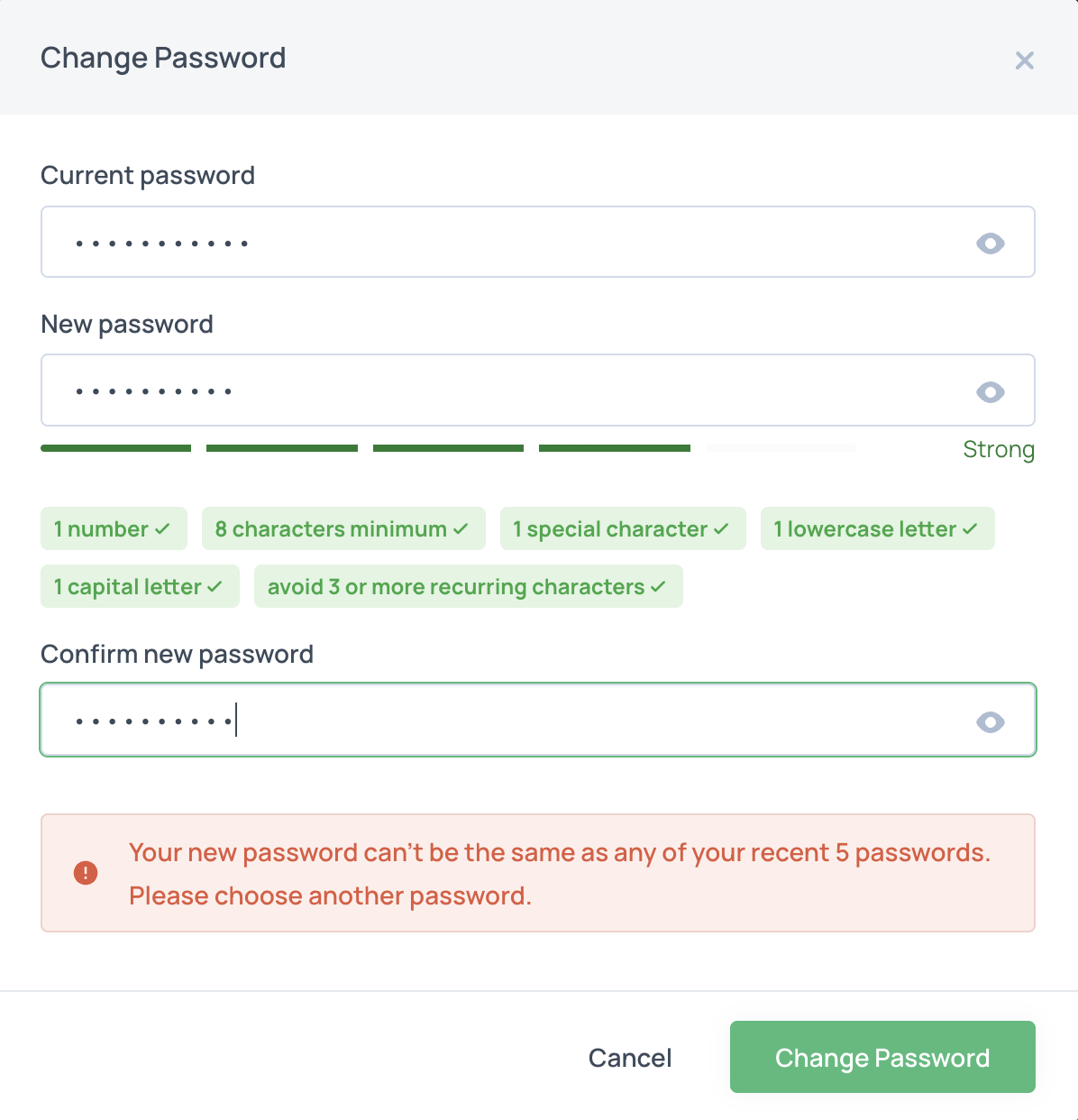 Prevent users from reusing previous passwords by requiring a certain number of new passwords before one can be reused. Admins can adjust this setting per account via the self-service portal.