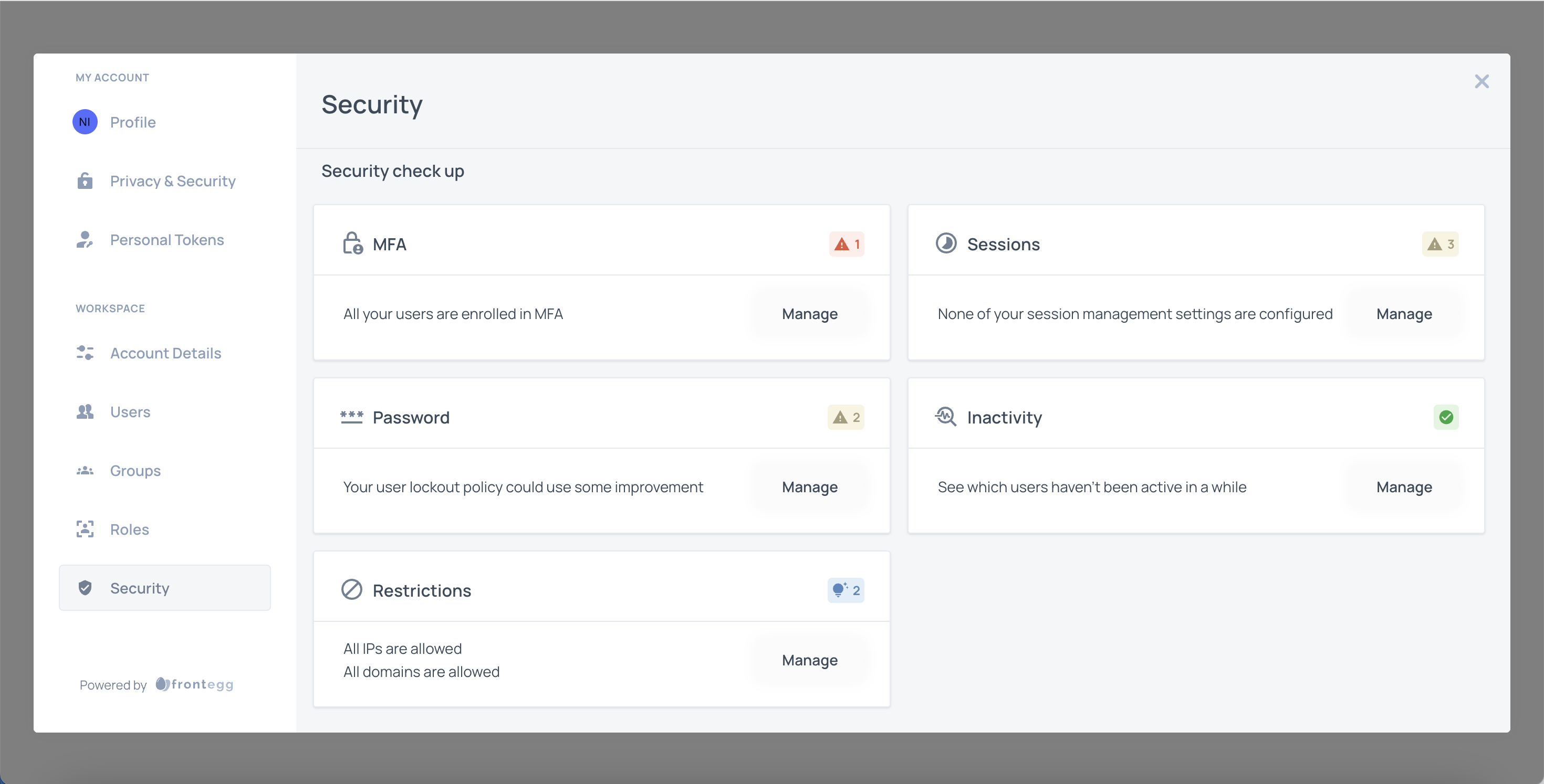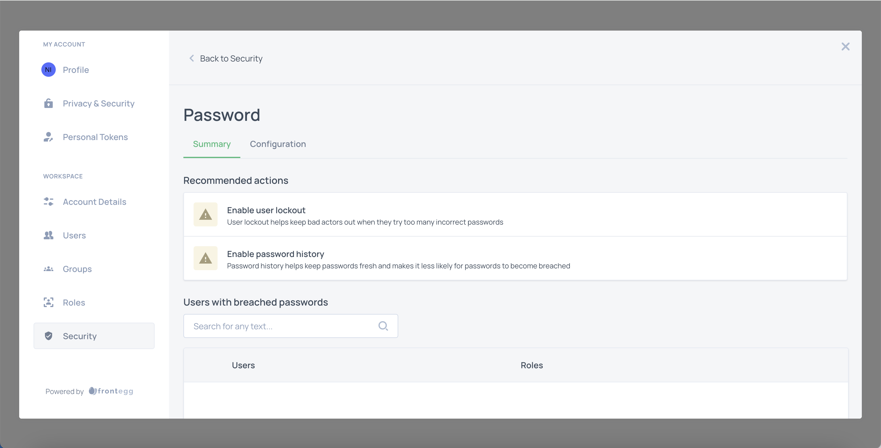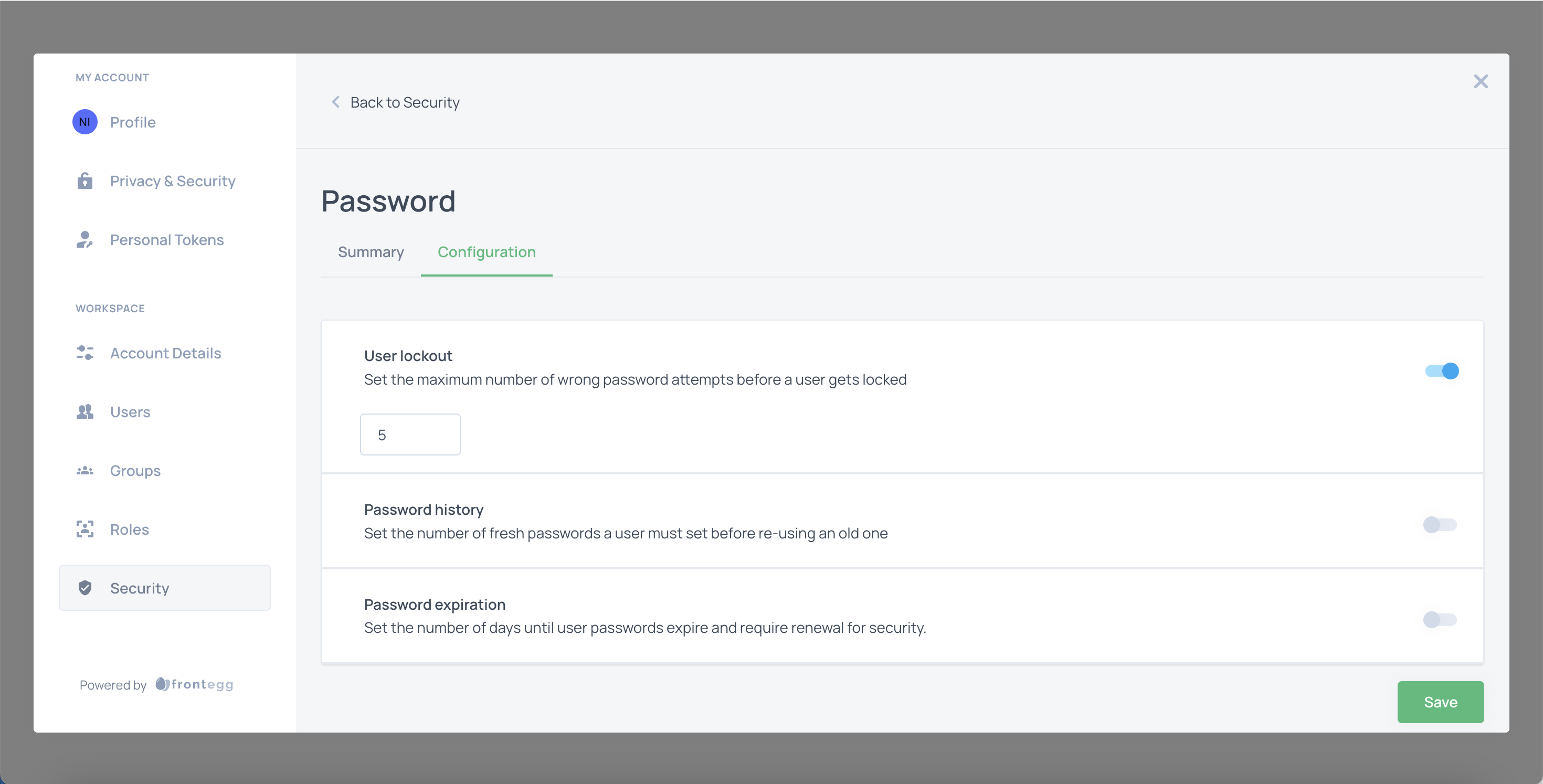 Admins can configure password-related policies for specific user accounts using the Frontegg self-service Admin Portal.