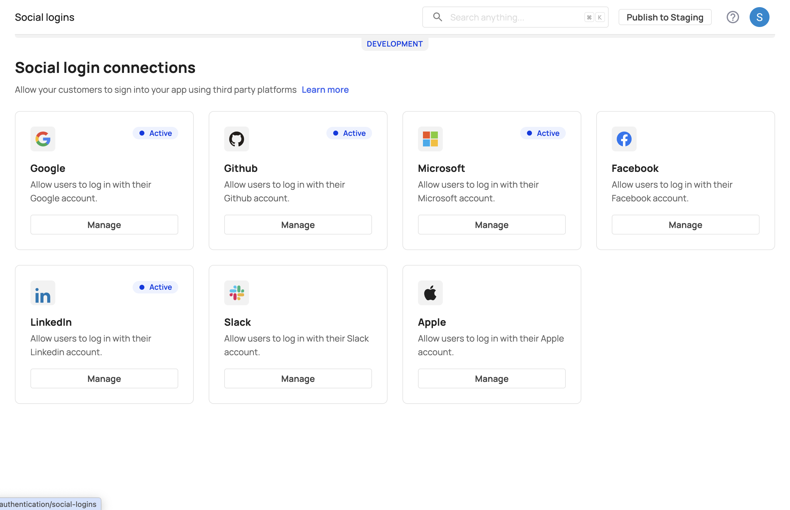 - Navigate to [ENVIRONMENT] ➜ Configurations ➜ Authentication ➜ Social logins and select Manage on the LinkedIn card.