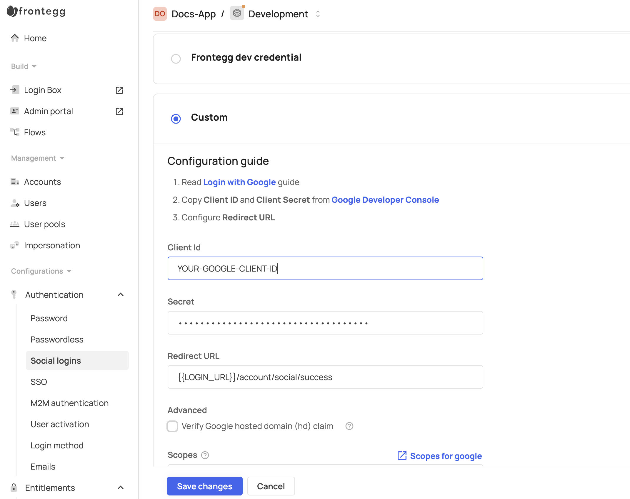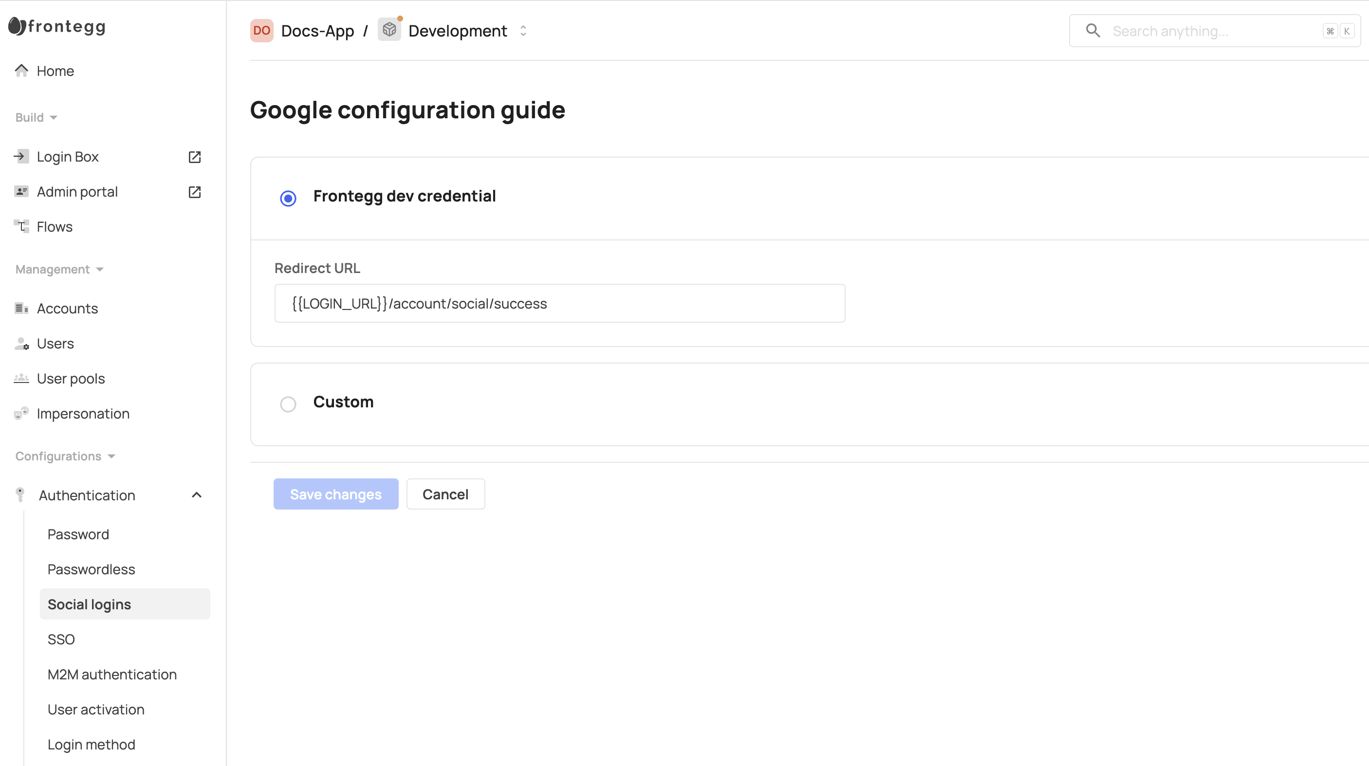 To get you up and running quickly in development mode, Frontegg provides you with preconfigured shared OAuth credentials and redirect URLs (except for LinkedIn login). This means the social logins work immediately when toggled on without requiring additional configuration.