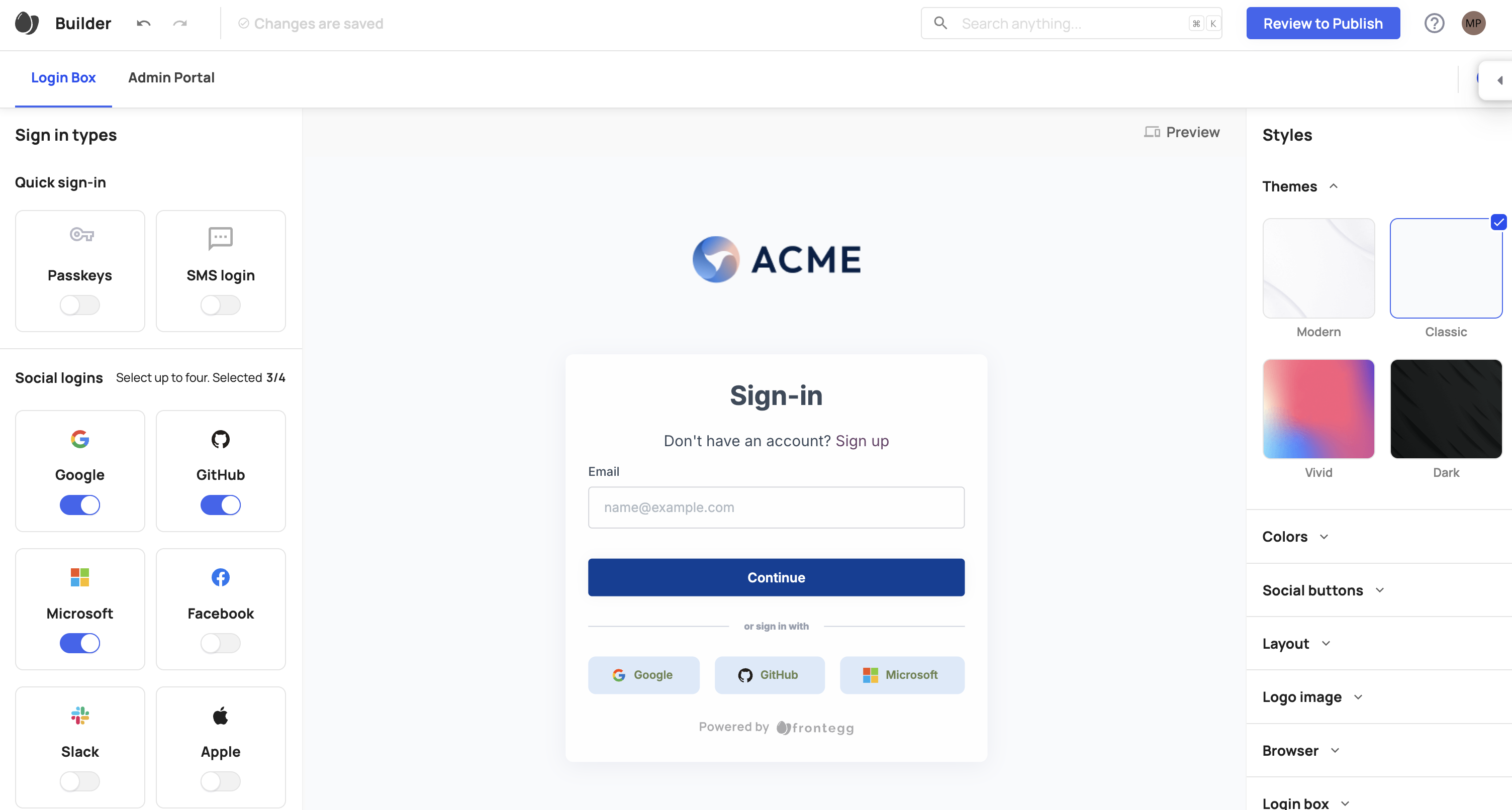 Open the Login Box page in the Frontegg portal and toggle on the social providers that you'd want to add to your login / sign-up page.