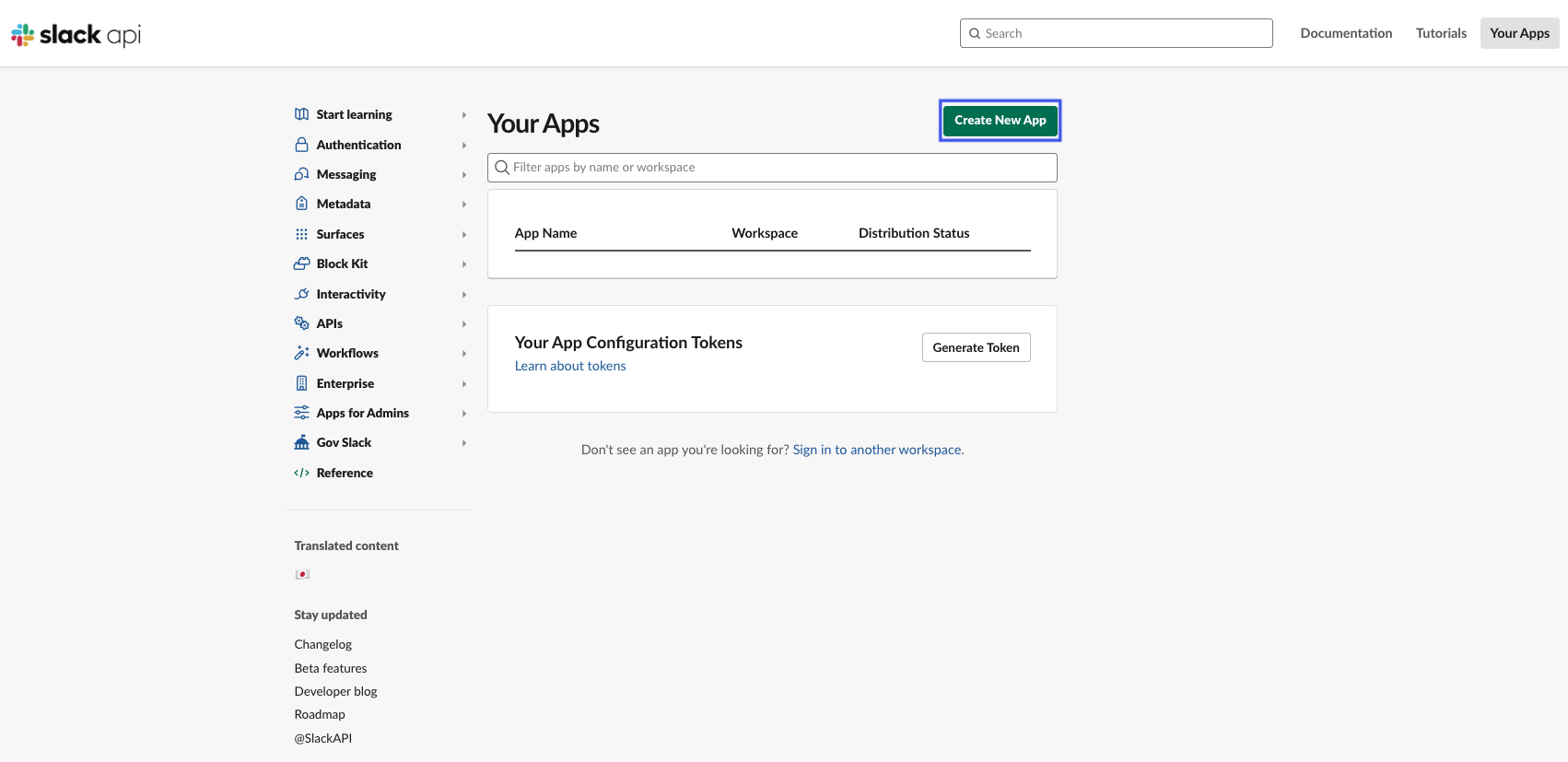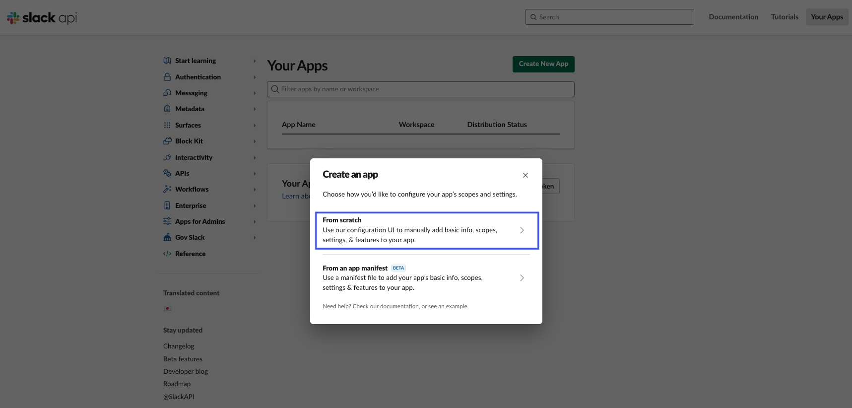 - Go to the Slack API, click on Your Apps, and then select Create an App.