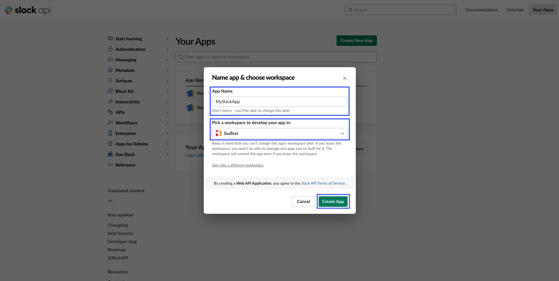 - Pick a name and a Workspace for your app, then click Create App.