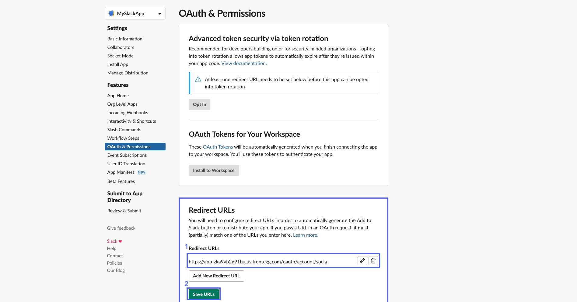 - Under Redirect URLs, add the redirect URL to which the user will be redirected upon successful login.
