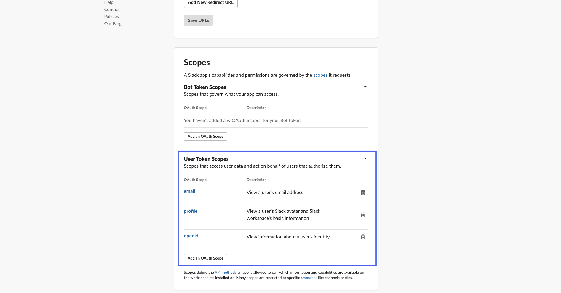 - Next, add scopes for retrieving user information from Slack: