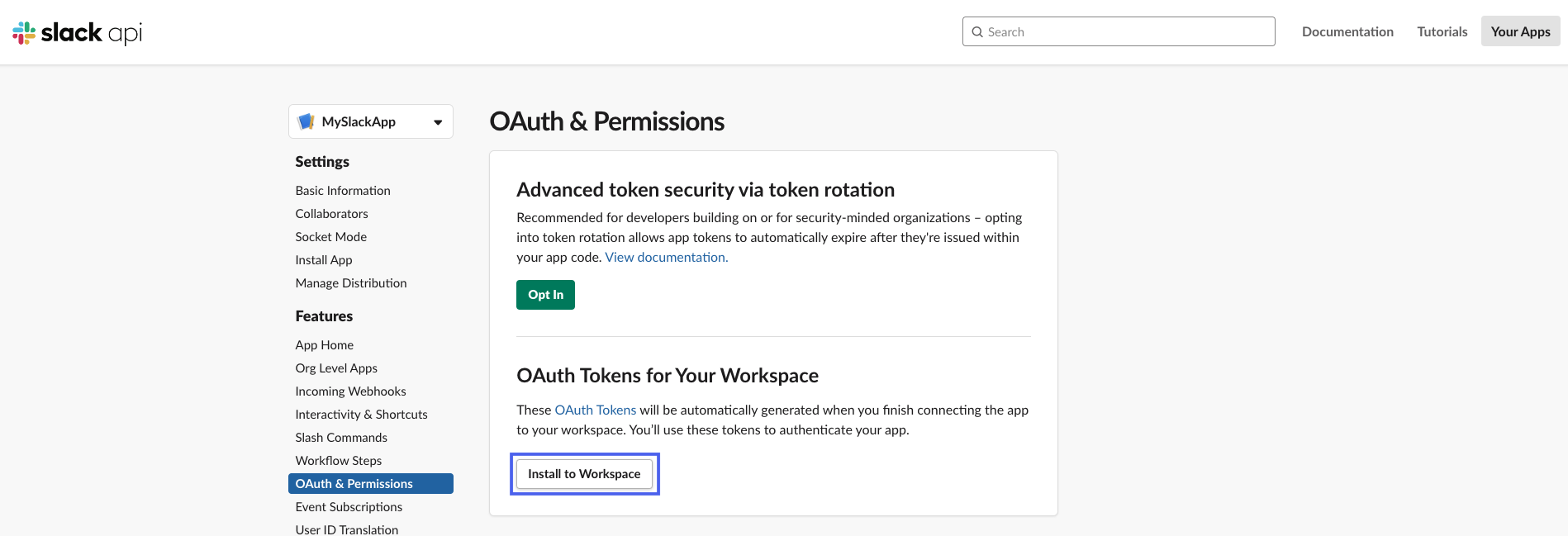 - At the top of the OAuth & Permissions page, click Install to Workspace.