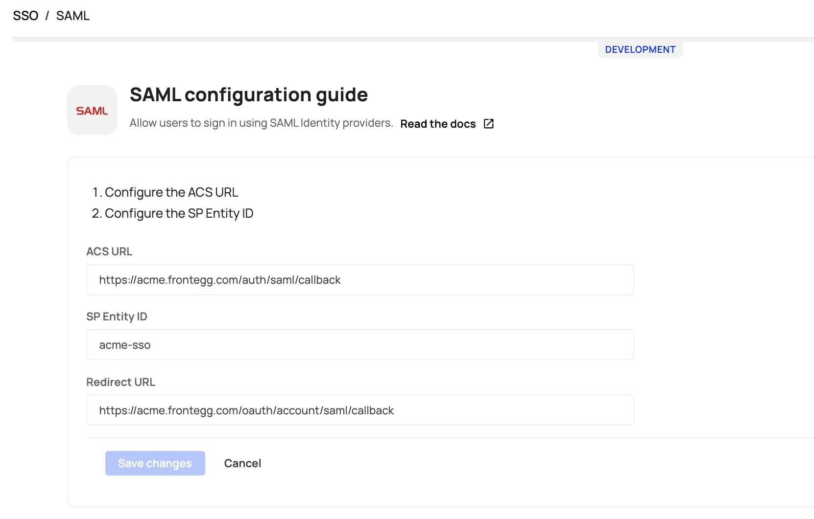 If you opt to not configure a custom domain, use your Frontegg subdomain followed by /auth/saml/callback for your ACS URL.