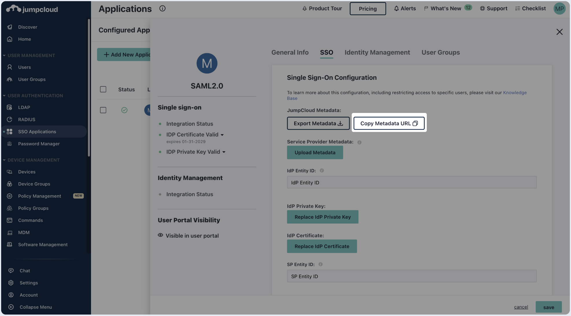 2. Copy the IDP URL and paste in the SSO Endpoint field below.