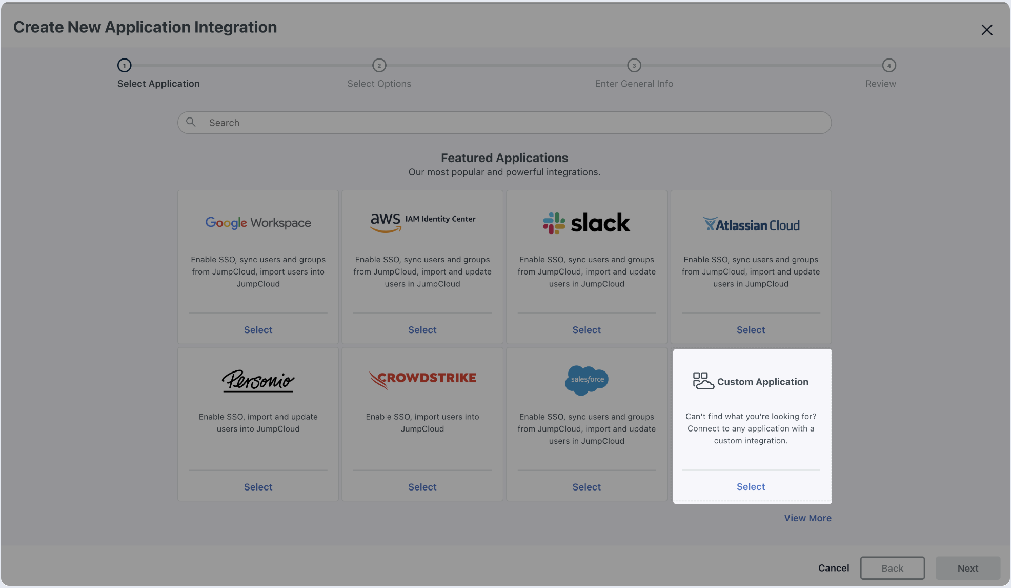 1. Log in to your Jumpcloud Application and click on Add New Application under the SSO Applications section.