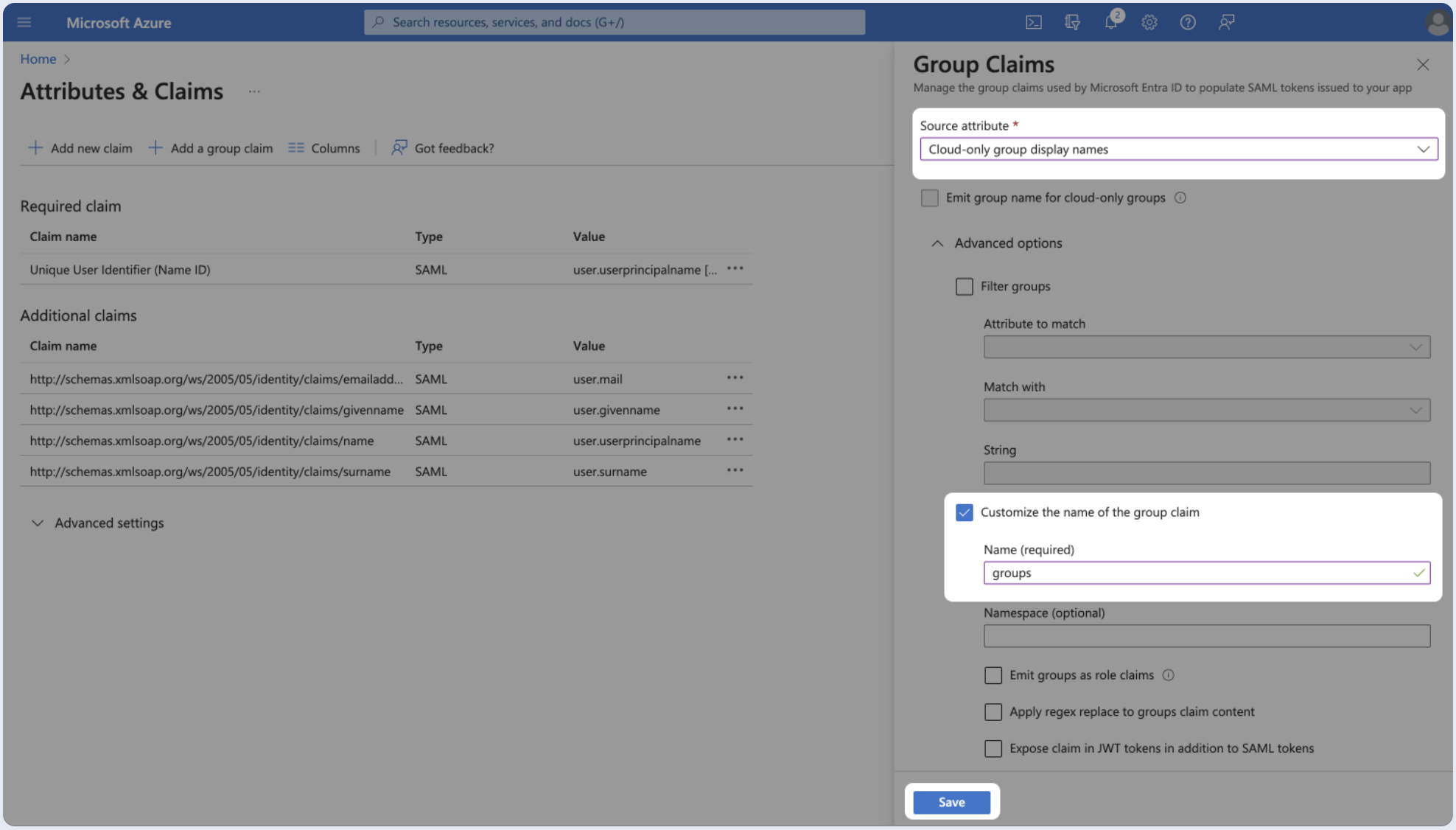- Choose whether the groups attribute will be transferred as an ID or as a name and edit the attribute name to be groups.