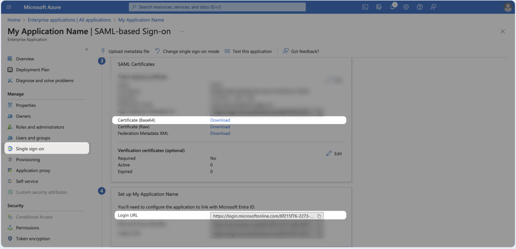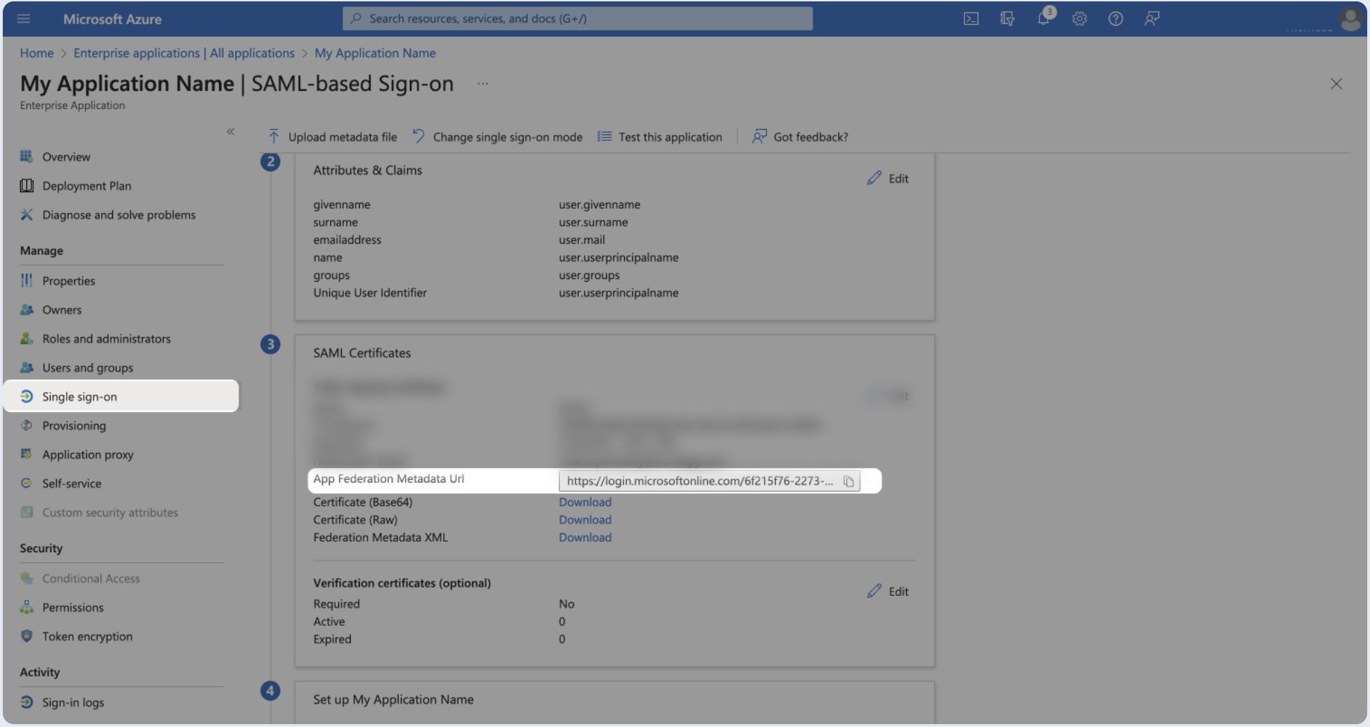 - Locate App Federation Metadata Url under SAML Signing Certificates.
