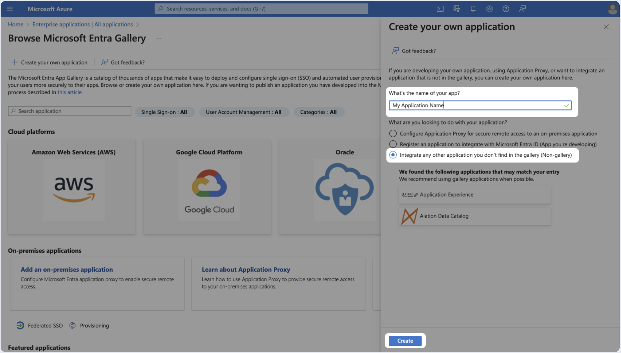 - Provide a name for your app, Select Integrate any other application you don't find in the gallery (Non-gallery), and click Create.