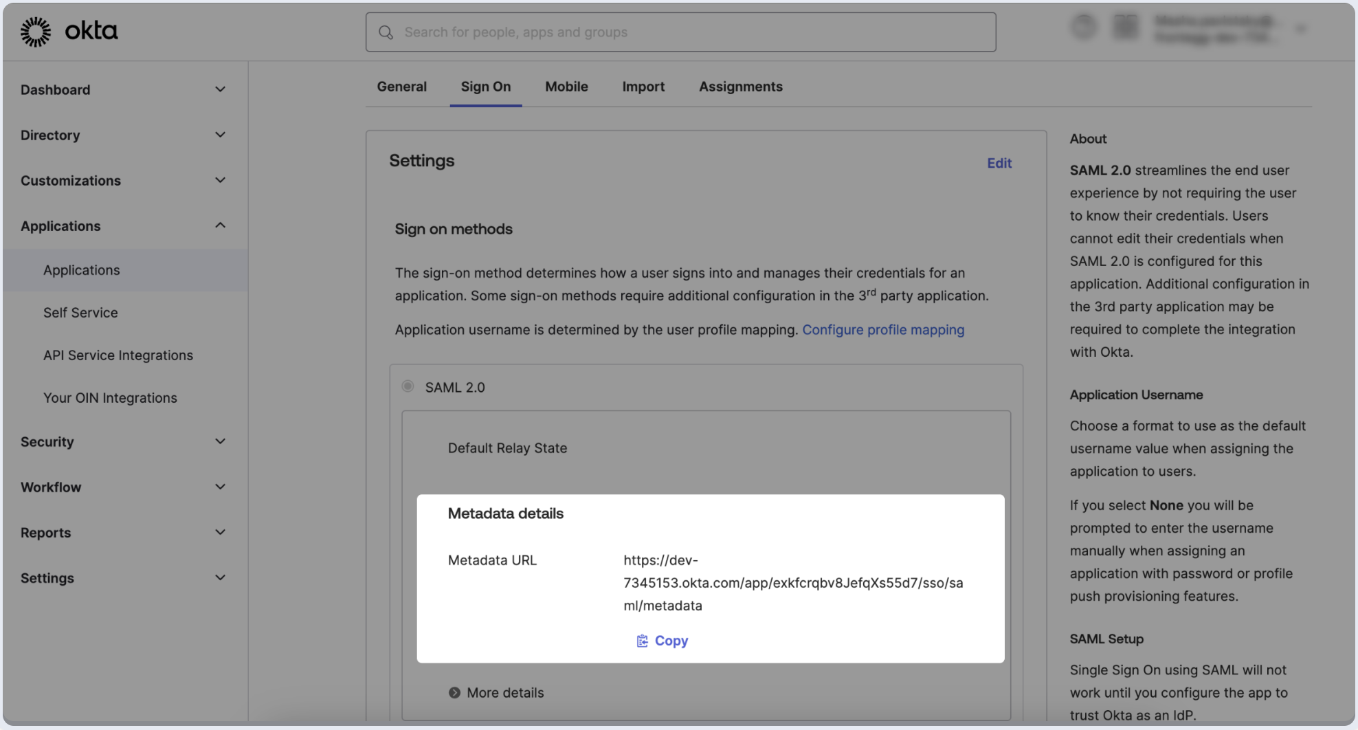 1. Click on the Sign On tab of the SAML app you just created.