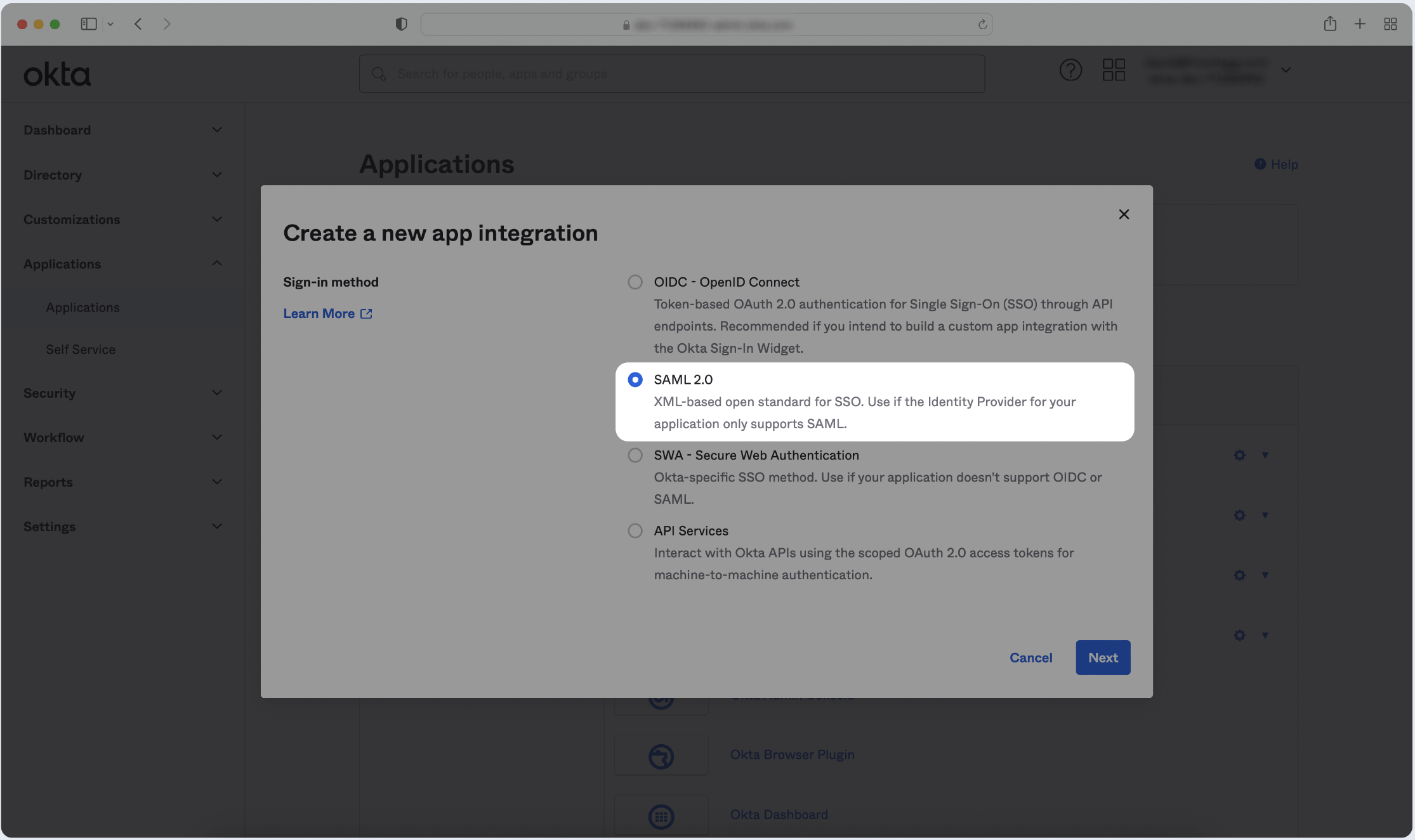 1. Click Create New App and choose SAML 2.0 as the Sign-in method. Then, click Next.