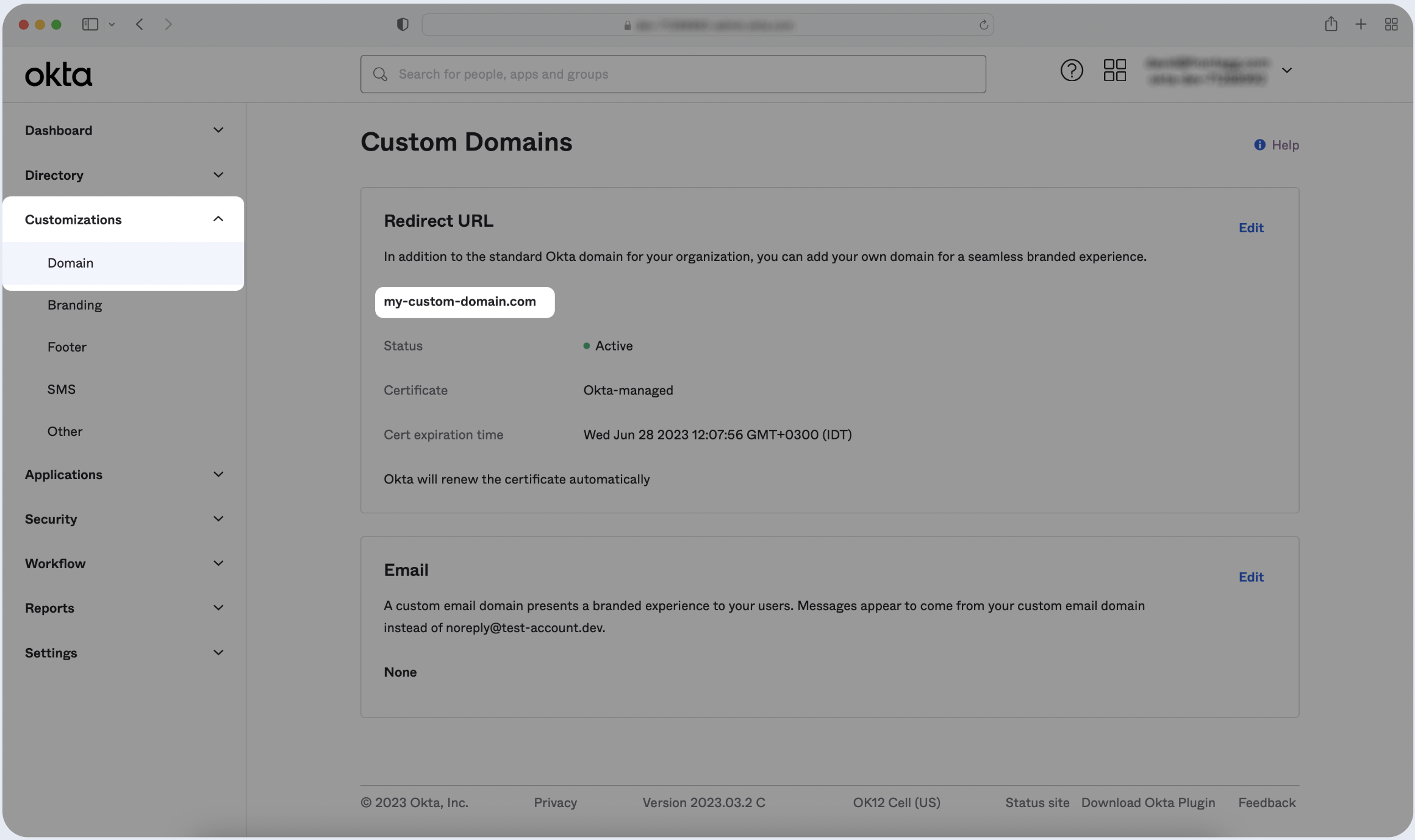 - In your Okta Application Dashboard go to Domain under Customizations in the sidebar.