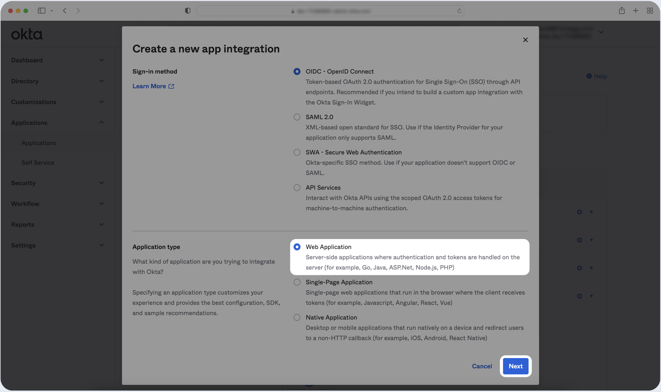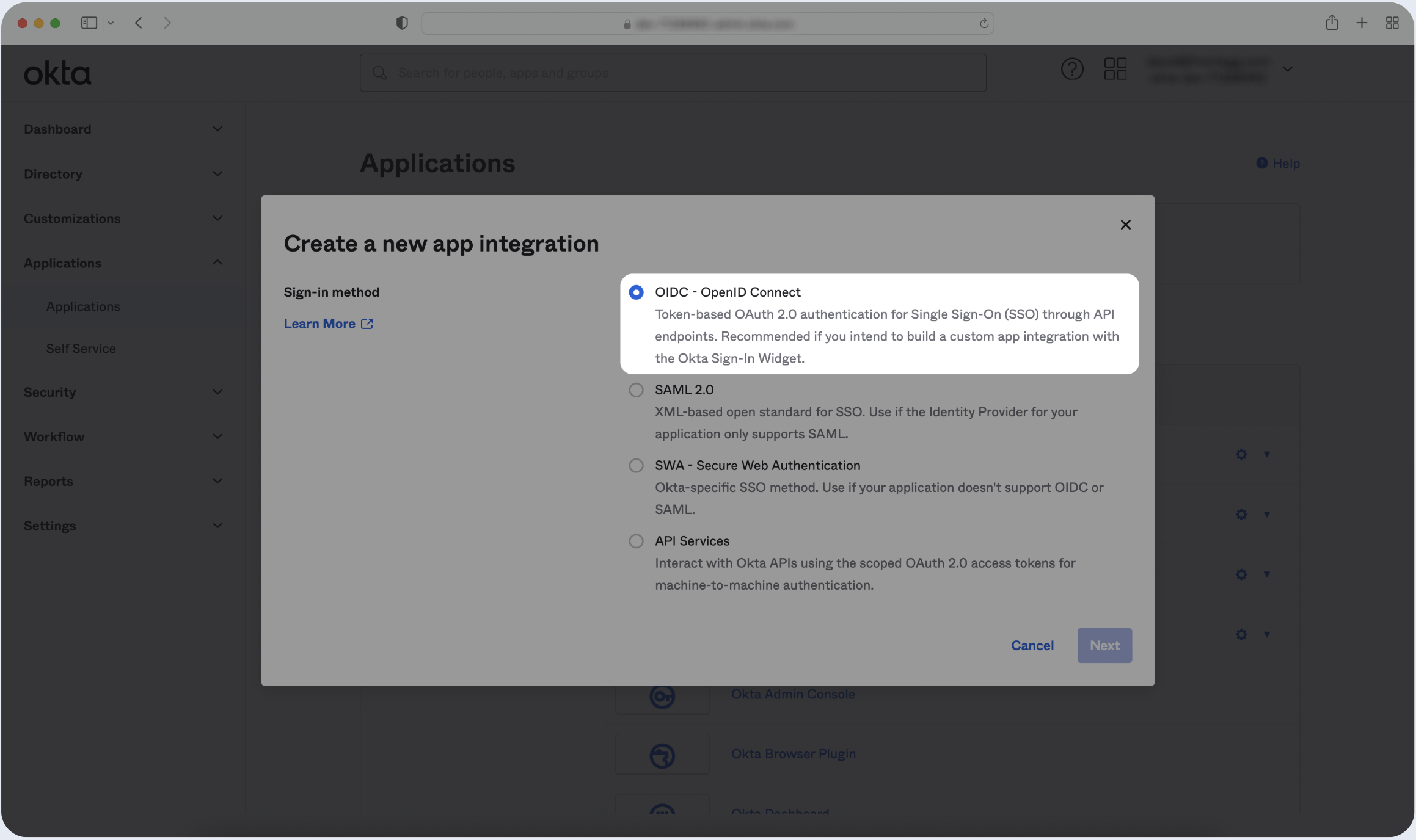 - Click Create New App and choose OIDC - OpenID Connect as the Sign-in method. Then, click Next.