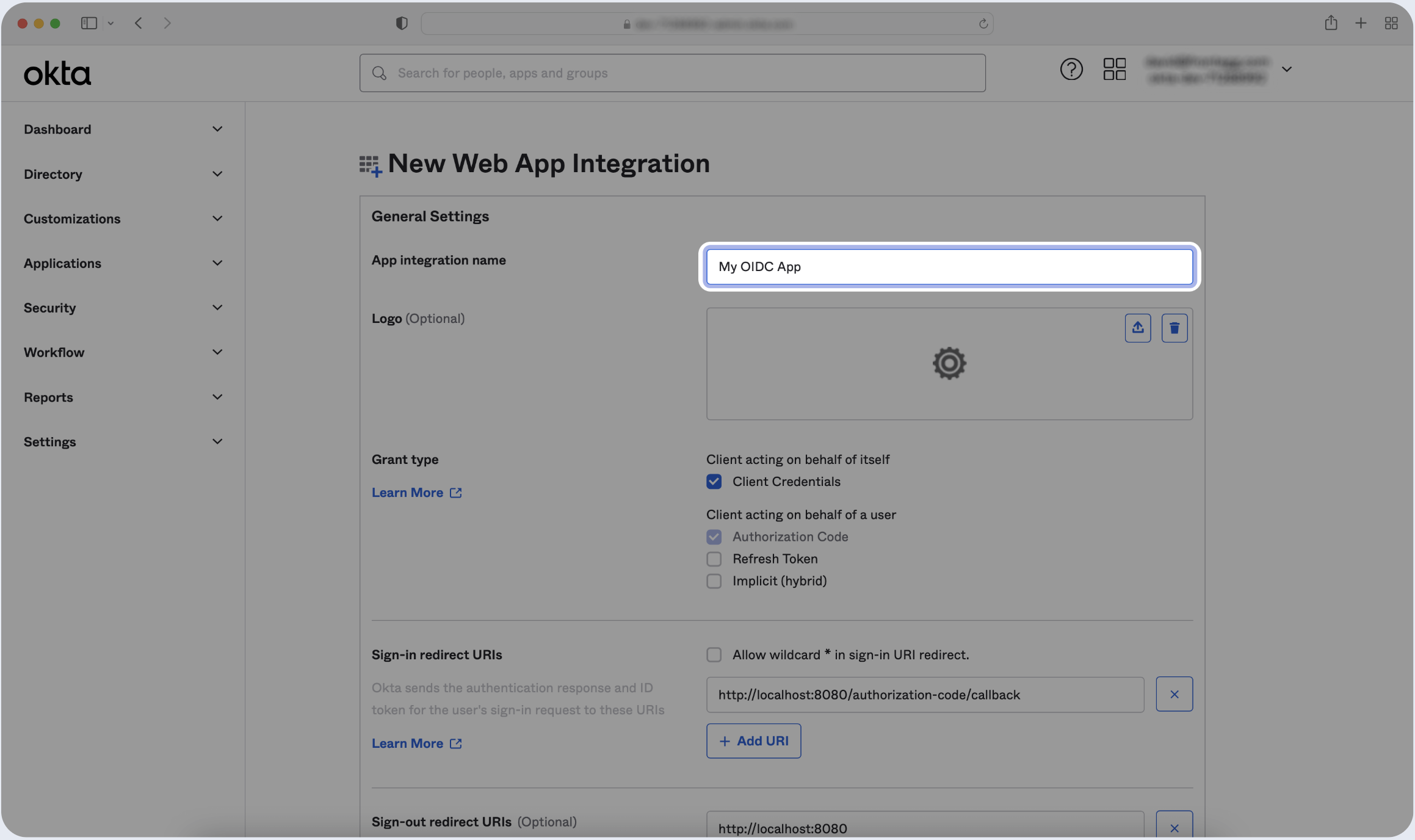 - Click on the Account button on the top-right corner of the OIDC app you just created.
