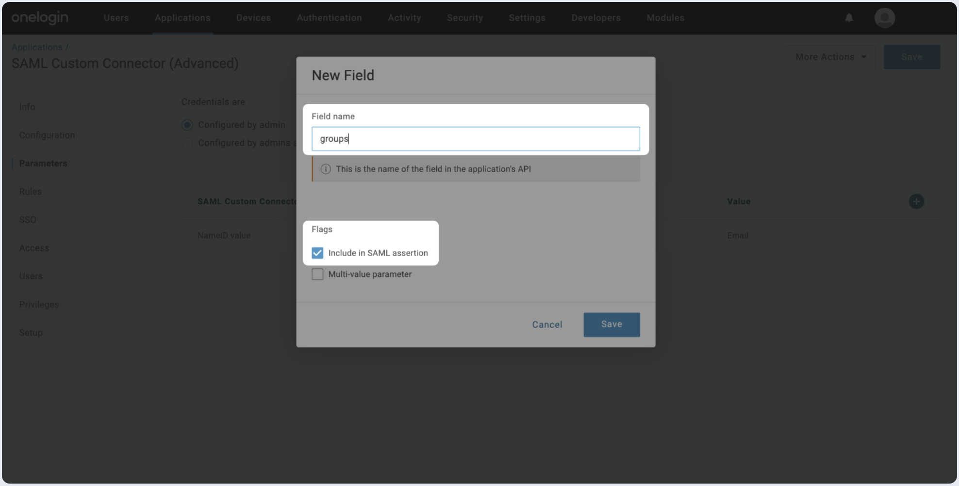 - A New Field modal will open up. The below example shows how to map user's memberOf attribute as groups in the saml response.