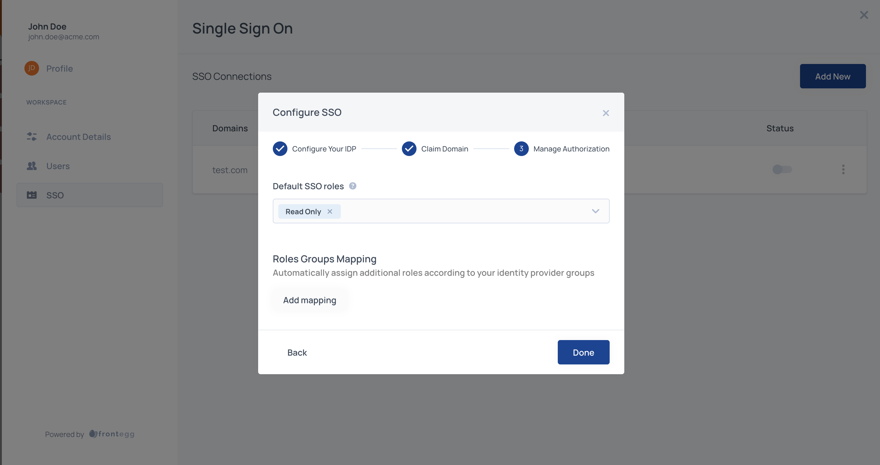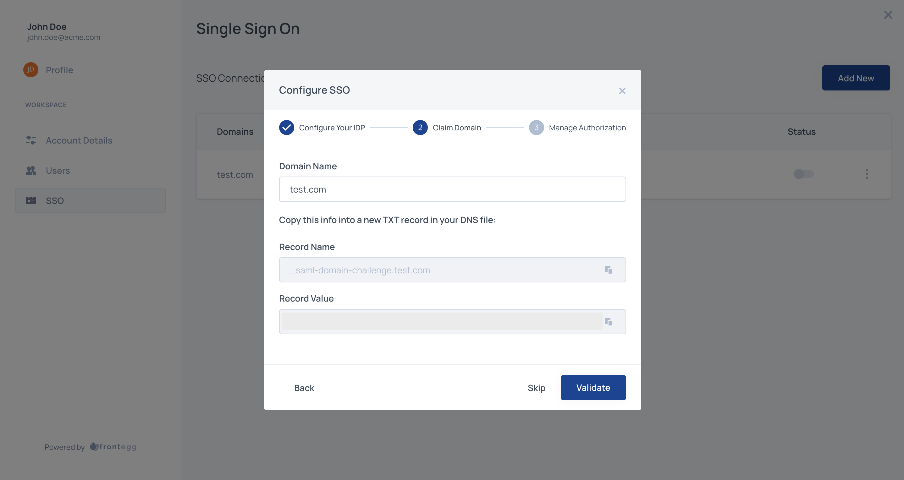Frontegg enforces domain validation for SSO connections initiated via self-service to prevent domain abuse and ensure each domain is uniquely tied to an account and environment.