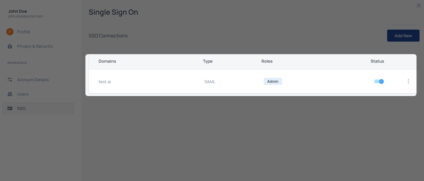 Users will be redirected to the SSO flow based on their email domain. For example, if a user from this organization will be logging in with john.doe@acme.com, configure the following step with acme.com. Claiming one or more domains for the account is necessary to prevent domain abuse.