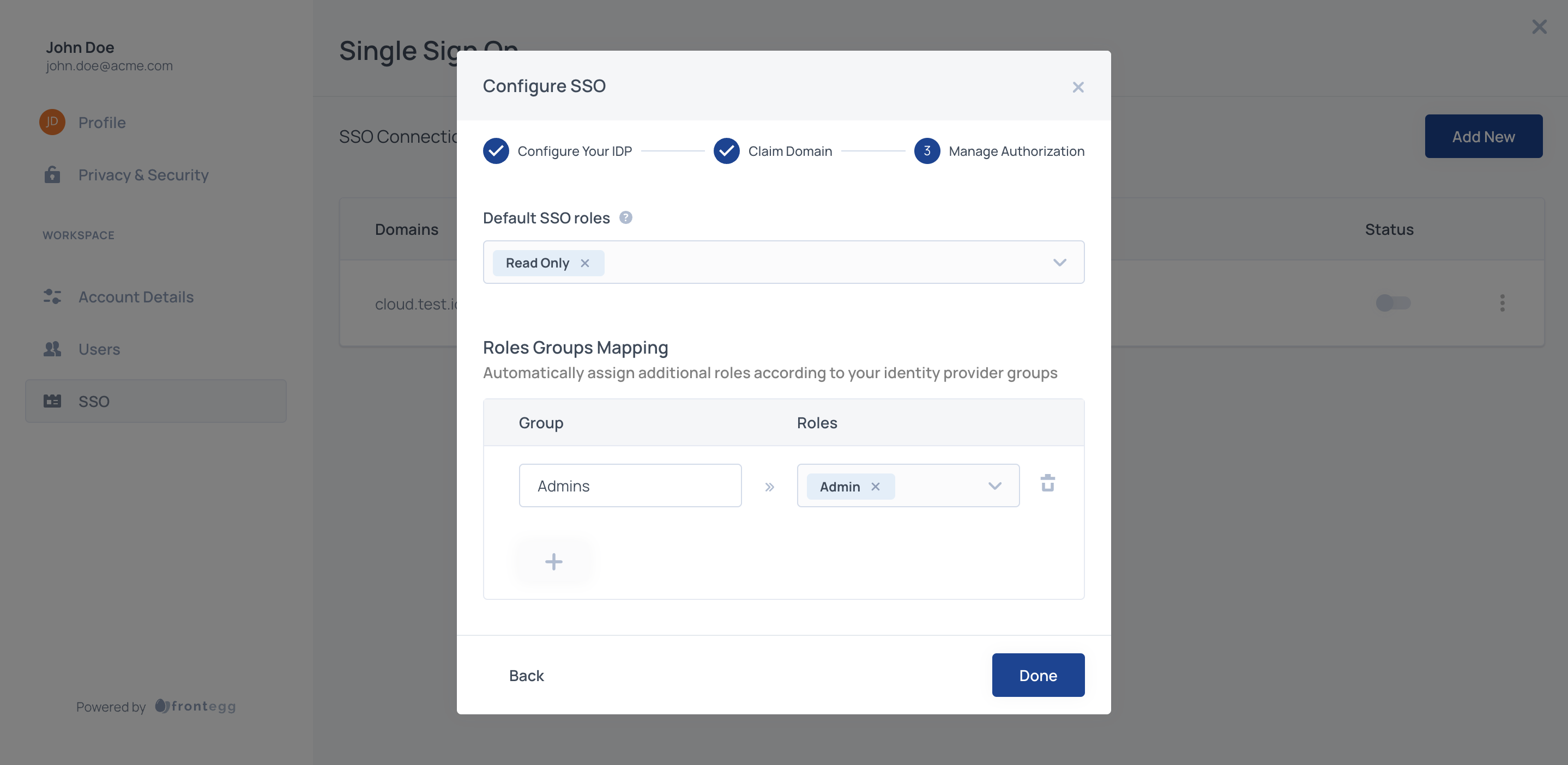 Assign default roles to all SSO users by adding one or more Frontegg roles from your list of predefined roles.