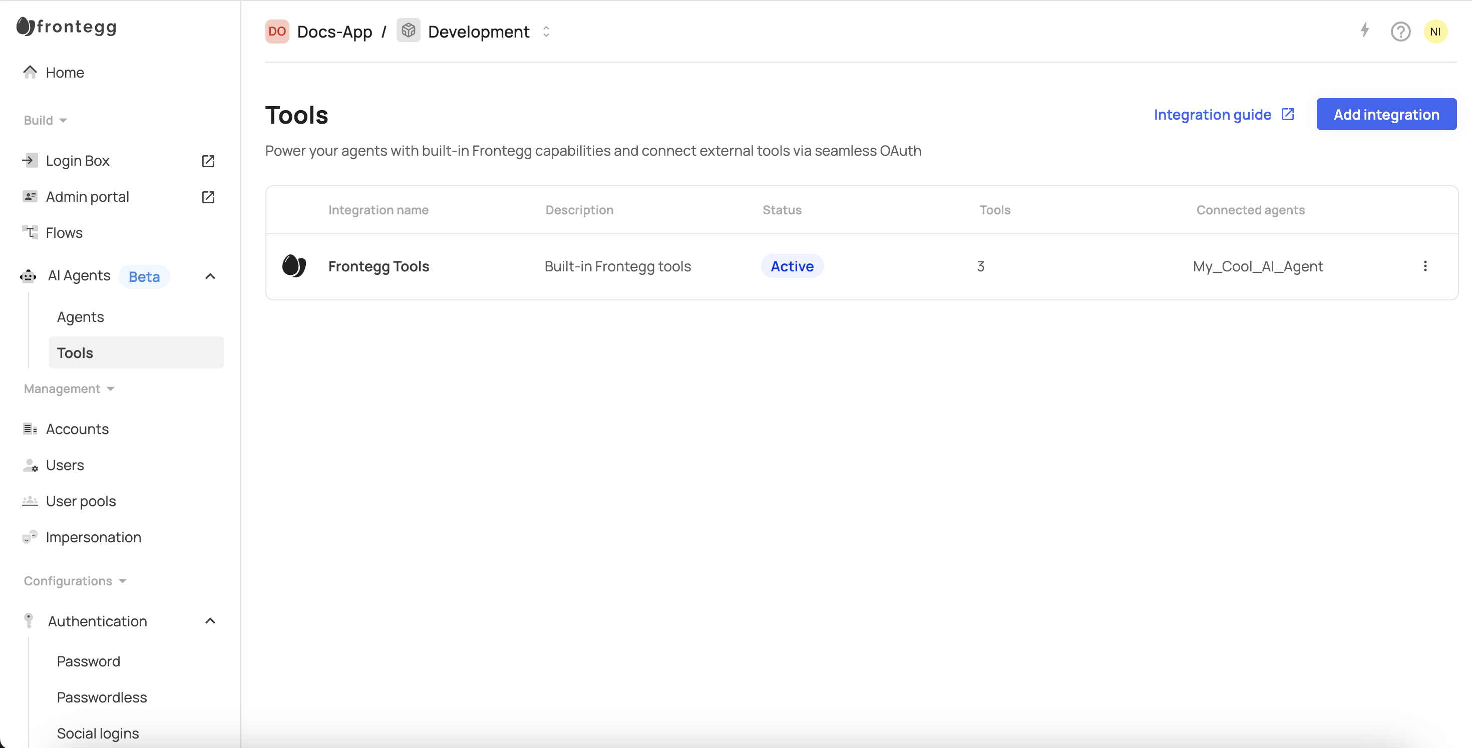 Frontegg.ai allows you to extend your agent’s capabilities by connecting it to built-in tools and external integrations. These tools enable your agent to act on behalf of authenticated users securely, using standardized OAuth flows.